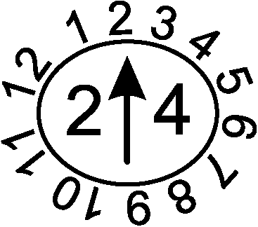 | Дата изготовления на подошве Цифра в центре круга соответствует году изготовления, а стрелочка указывает месяц изготовления. Как правило, такая пиктограмма присутствует на подошве литьевого метода крепления низа специальной обуви |