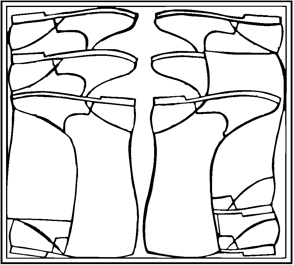 Полусапоги и ботинки из юфти и с берцами из искусственных и синтетических материалов | - | Дощатые ящики из древесных листовых материалов, картонные ящики | Попарно связанные полусапоги и ботинки укладывают в ящики рядами. Полупары в паре укладывают носками в разные стороны, берец верхней полупары на носок нижней полупары. Смежные полупары укладывают подошвами друг к другу, каблуками в разные стороны (см. рисунок Г.3). Полусапоги, имеющие металлические пряжки или застежки, укладывают пряжками или застежками в разные стороны (см. рисунок Г.4). Каждый ряд обуви перекладывают оберточной бумагой |
