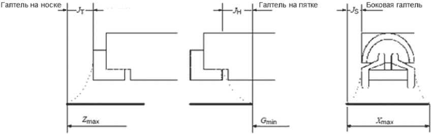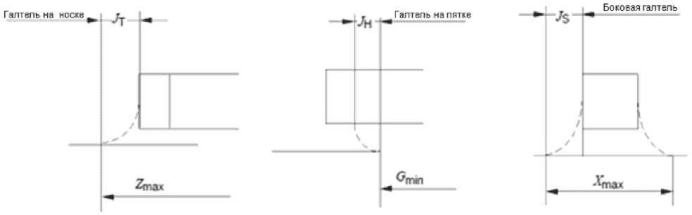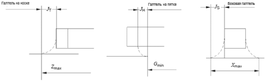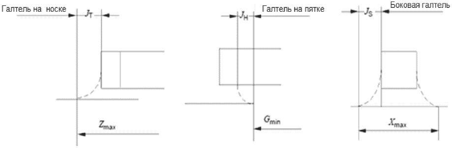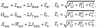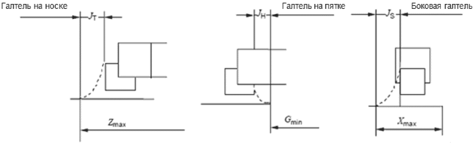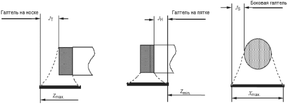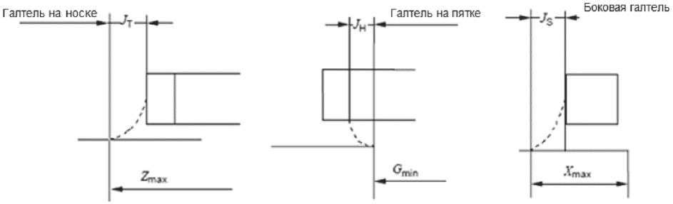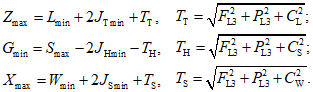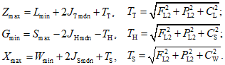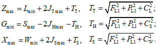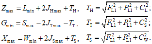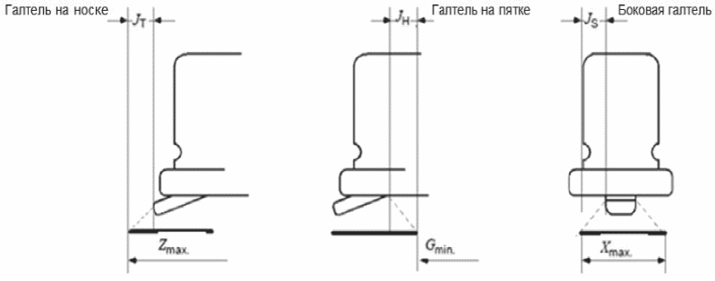 Форма и размеры галтели припоя после процесса пайки представлены на рисунке 32. Наименьшие (min), средние (mdn) и наибольшие (max) размеры каждой галтели на носке JT, пятке JH и боковых сторонах JS контакта приведены с учетом надежности паяного соединения, а также качества и производительности в процессе монтажа компонентов. Проектирование посадочных мест с учетом размера галтели нуждается в рассмотрении трех факторов, имеющих отношение к погрешности: погрешность размеров компонентов C, погрешность установки компонентов на печатных платах P и погрешность геометрии контактной площадки печатной платы F. Далее приведены формулы расчета допуска с учетом этих факторов.