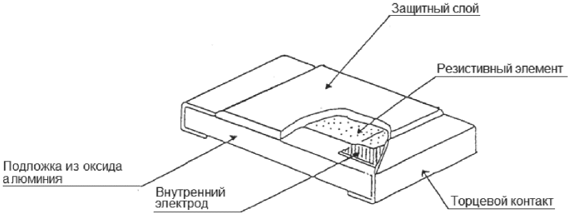 Типовая конструкция представлена на рисунке 2. Резистивный материал нанесен на керамическую подложку и симметрично заканчивается с двух сторон металлическими контактами в форме U. Резистивный материал расположен сверху. Так как в большинстве видов оборудования используют вакуумный захват, важно, что бы поверхность резистора была плоской, в противном случае будет сложно манипулировать в процессе установки резистора.