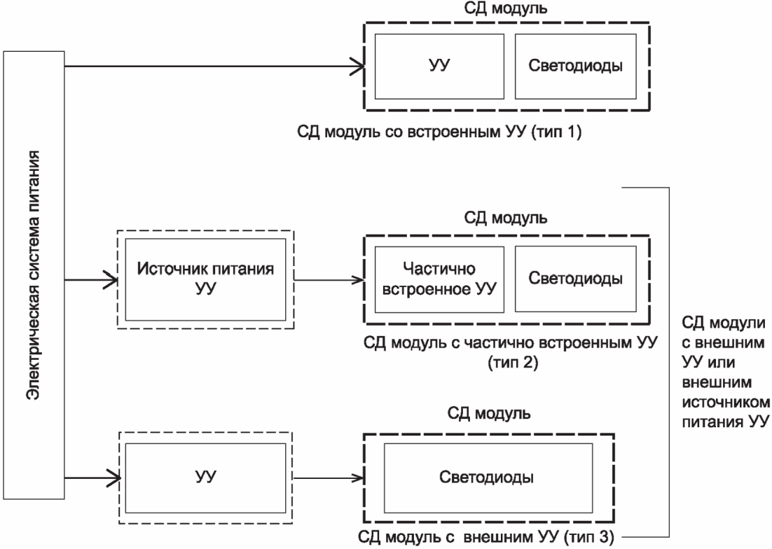 - тип 3 - СД модули с внешним УУ, стабилизирующим напряжение, ток питания или мощность.