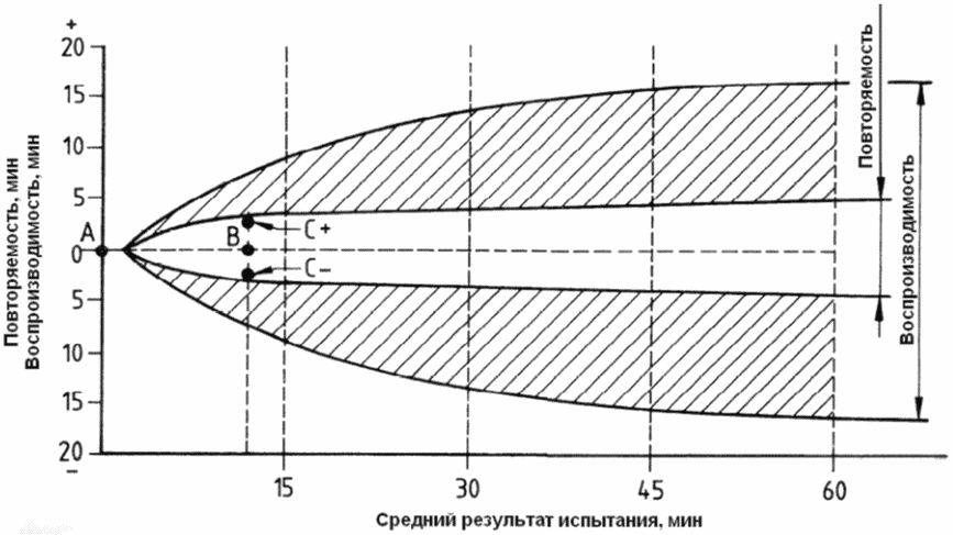 Вычисляют средний результат испытания в минутах. Перемещаются от точки A на оси ординат вправо в точку B по оси абсцисс. Вычисляют и наносят на диаграмму точки отклонения C+ и C- от среднего значения результата испытания. Если точки отклонения попадают в область повторяемости, результаты расположены в пределах прецизионности испытания.