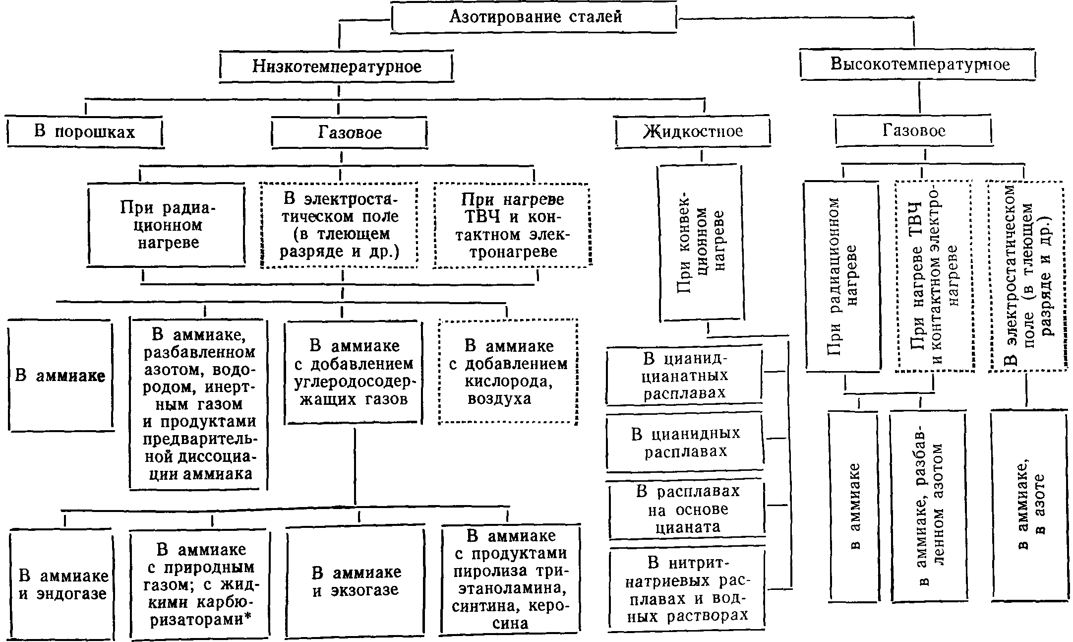 1.2. Процессы азотирования классифицируют в зависимости от температуры проведения процесса, способа нагрева и агрегатного состояния насыщающей среды. Классификация процессов азотирования представлена на