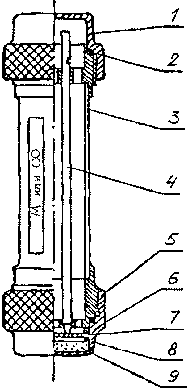 - извлечь концентратор с маркировкой "CO" с отобранной пробой воздуха из контейнера и поместить в инжектор испарителя конусной частью вниз до упора в колонну;