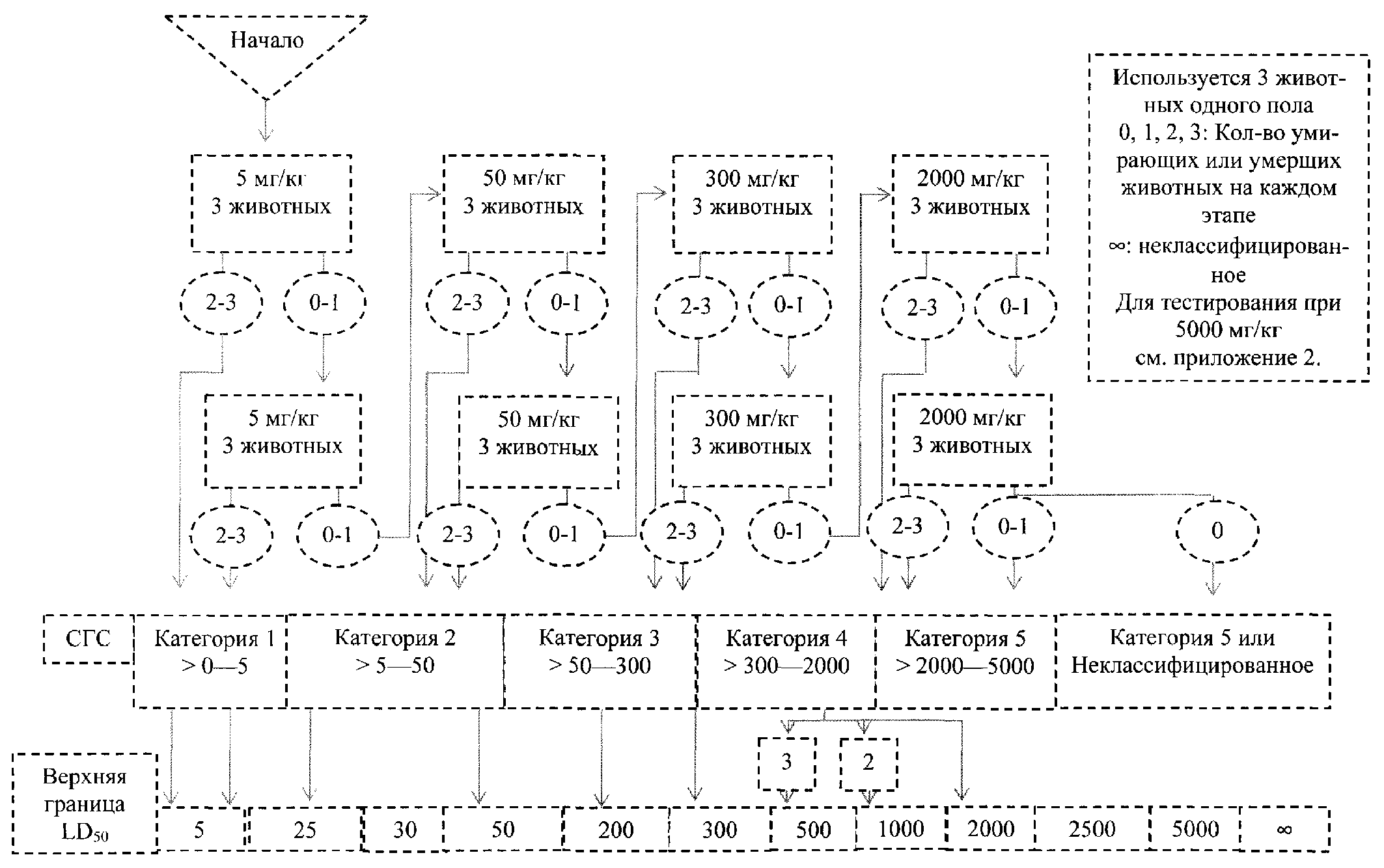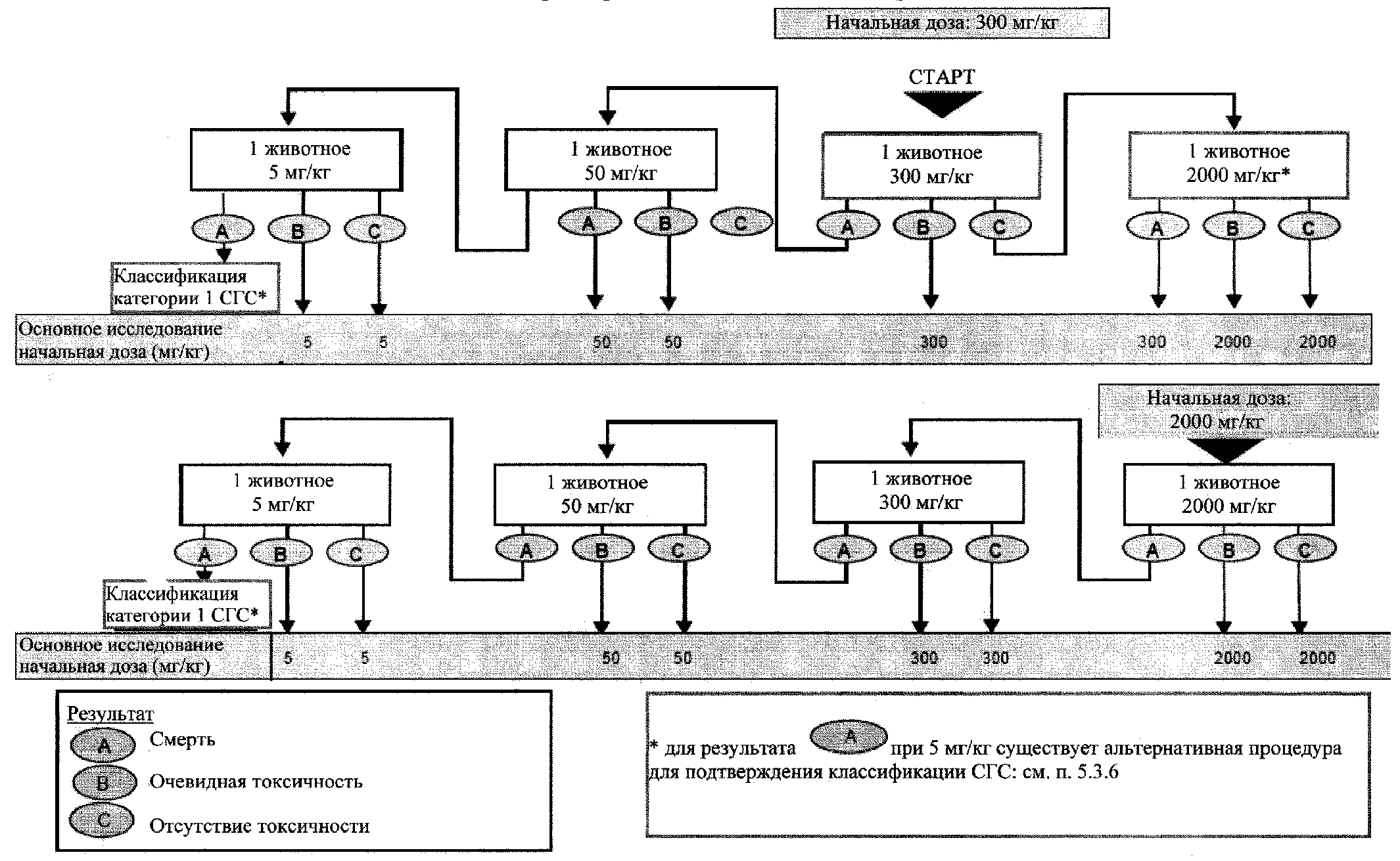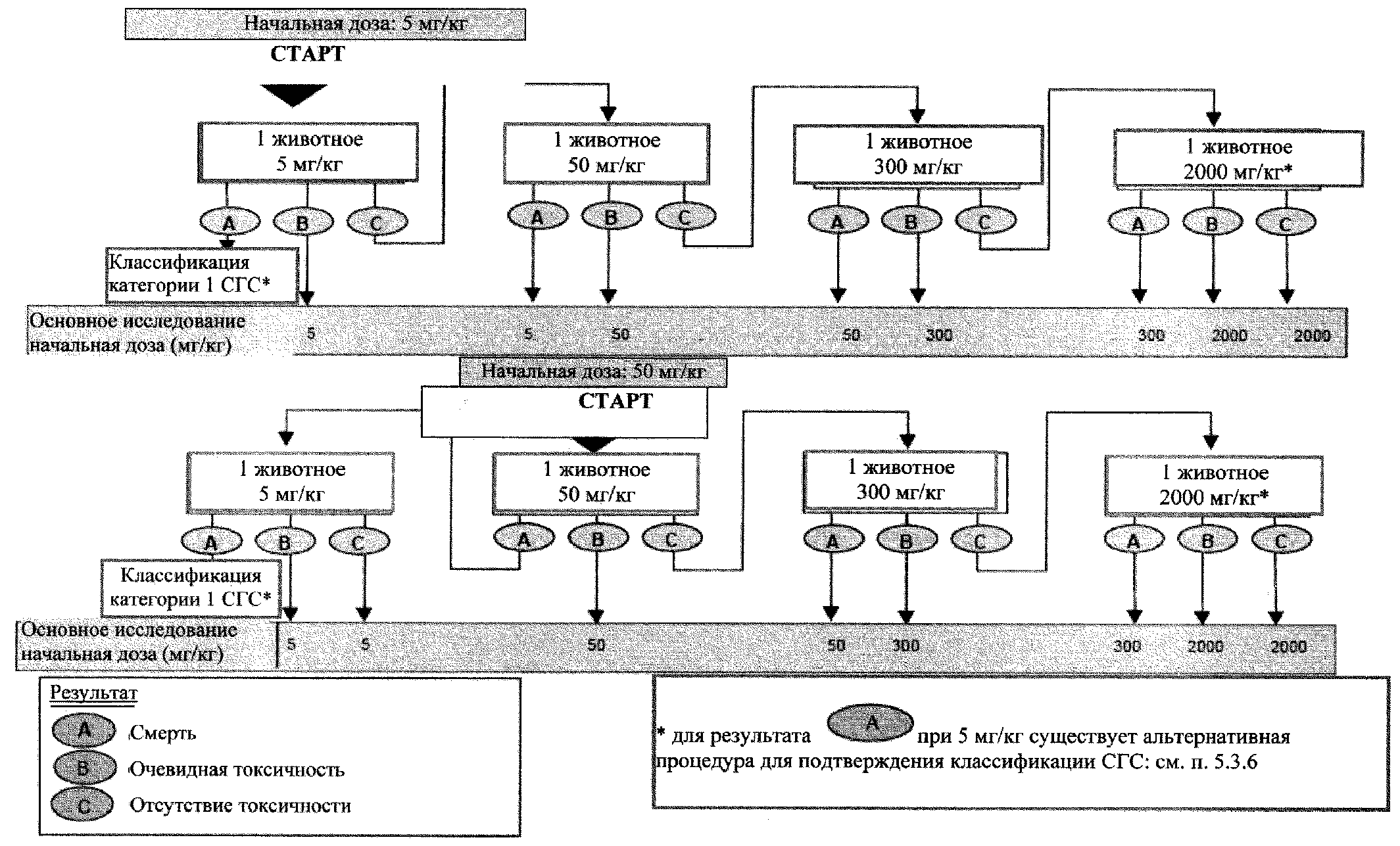 4.3.6. Если доза около 2000 мг/кг массы тела при однократном режиме воздействия или двух введениях в один день не оказывает токсического действия, и если не предполагают генотоксичность по результатам исследований со структурно связанными соединениями, то полную схему исследований с использованием 3 уровней доз можно не проводить. Для опытов с длительным введением максимальная доза составляет 2000 мг на кг массы тела в день при длительности введения до 14 дней и 1000 мг на кг массы тела в день при длительности введения более 14 дней. Ожидаемая экспозиция для человека может указывать на необходимость использования более высоких доз в опытах по установлению порогов.