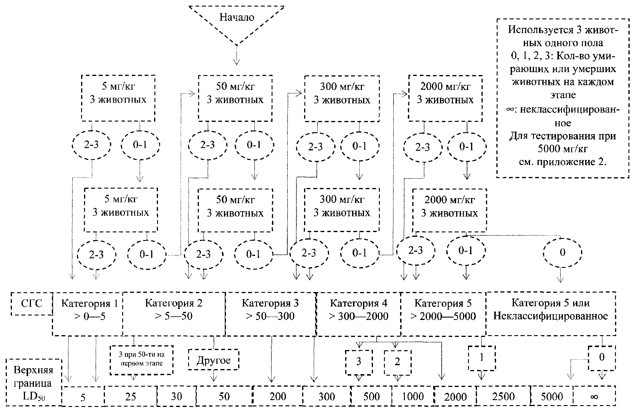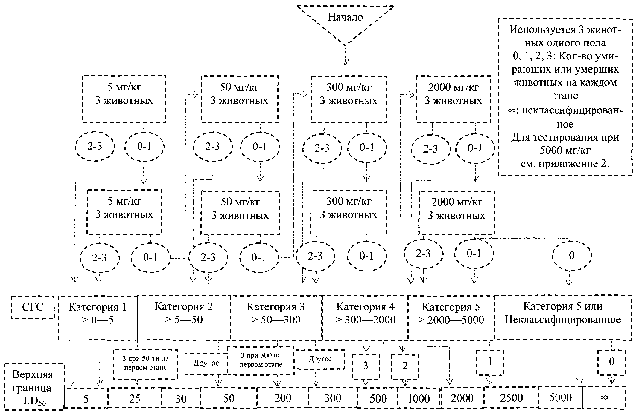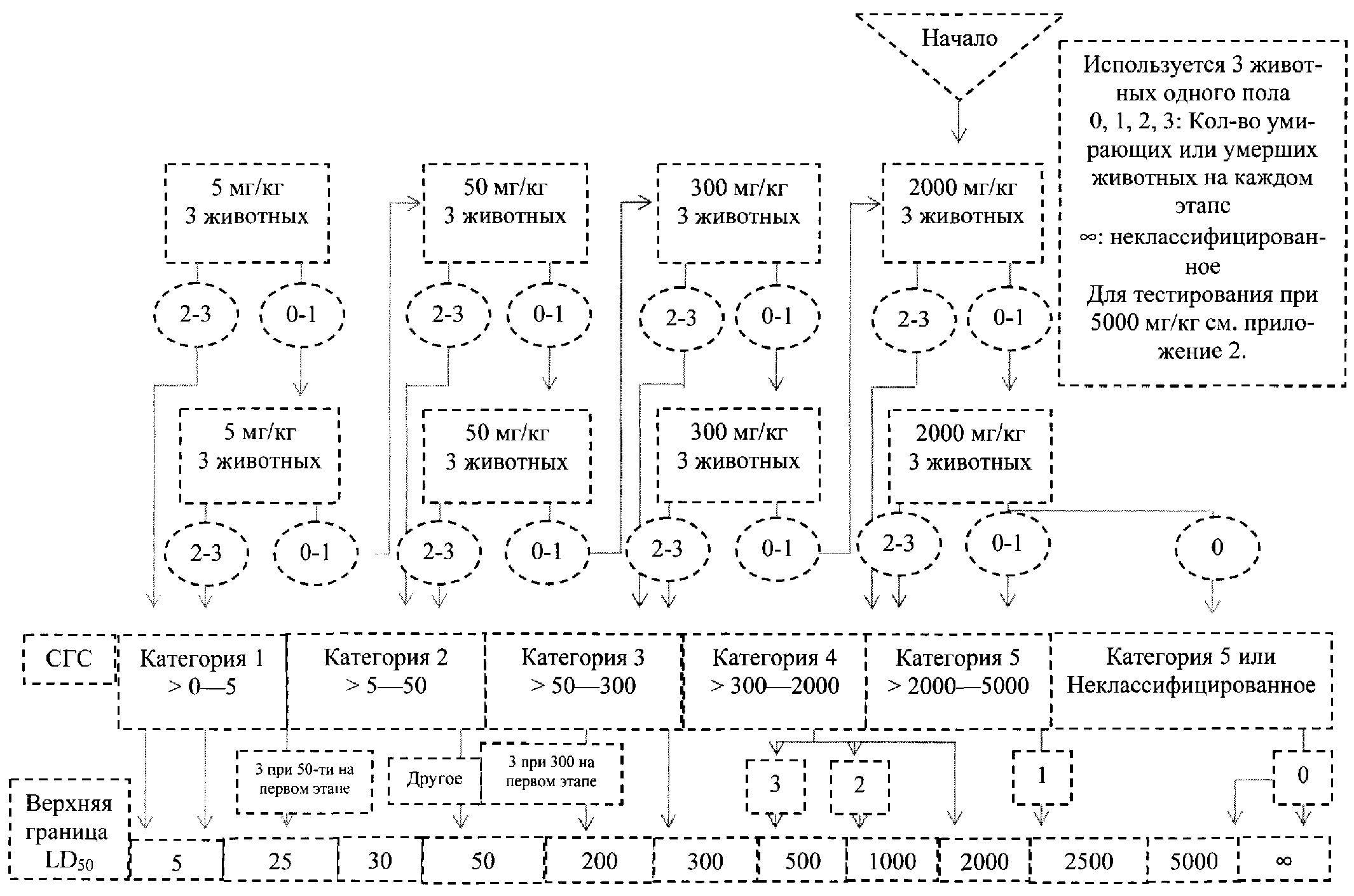 4.3.6. Если доза около 2000 мг/кг массы тела при однократном режиме воздействия или двух введениях в один день не оказывает токсического действия, и если не предполагают генотоксичность по результатам исследований со структурно связанными соединениями, то полную схему исследований с использованием 3 уровней доз можно не проводить. Для опытов с длительным введением максимальная доза составляет 2000 мг на кг массы тела в день при длительности введения до 14 дней и 1000 мг на кг массы тела в день при длительности введения более 14 дней. Ожидаемая экспозиция для человека может указывать на необходимость использования более высоких доз в опытах по установлению порогов.