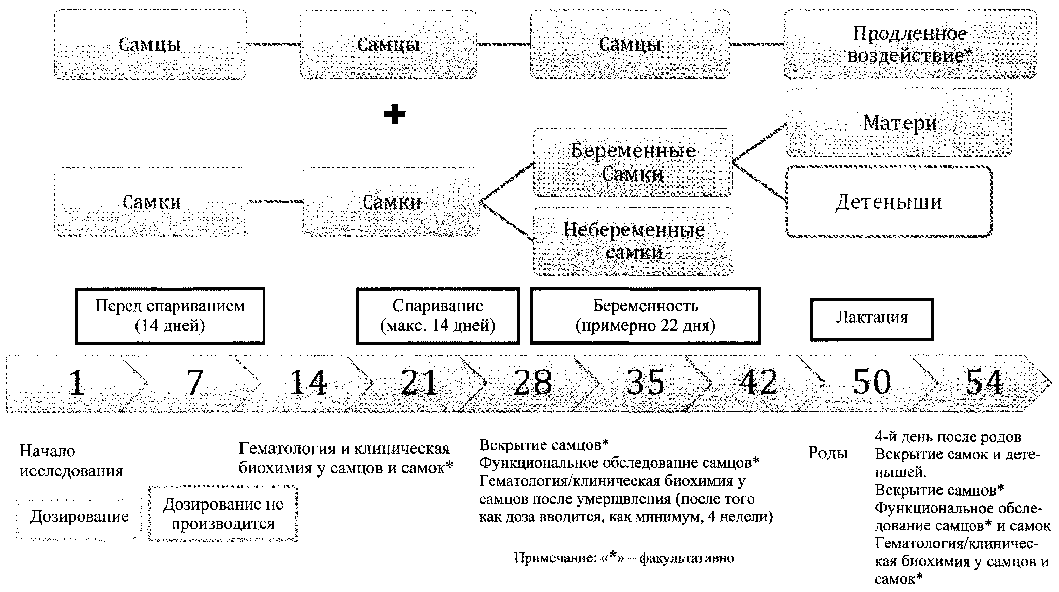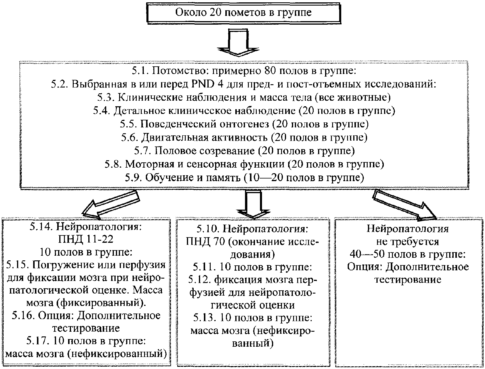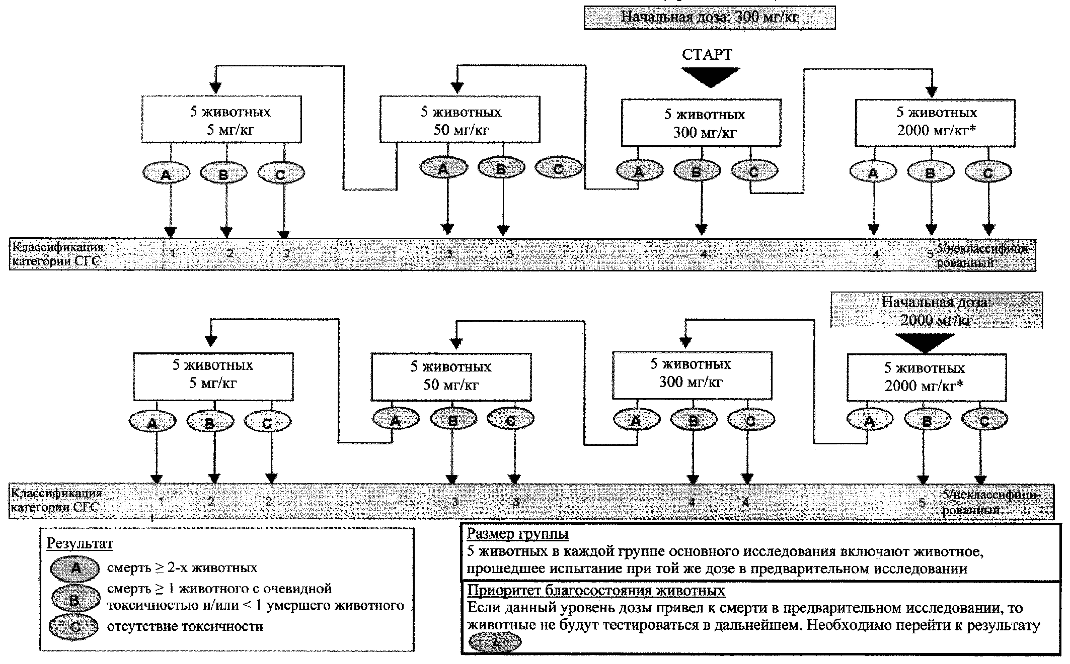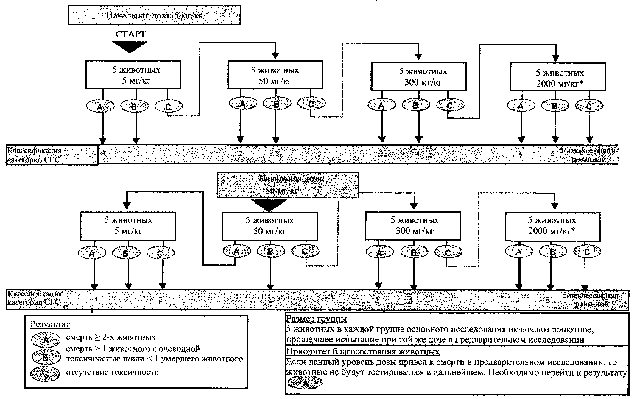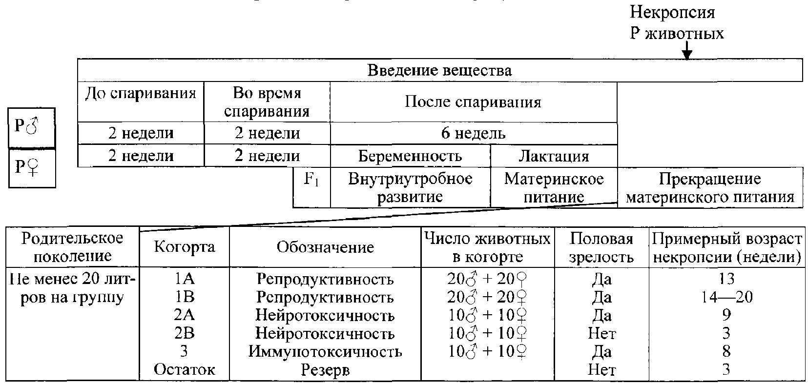 4.3.1. В каждой экспериментальной и контрольной группе должно быть как минимум 5 животных каждого пола. Если ко времени проведения исследования имеются данные работ на том же виде животных и при той же схеме введения, которые указывают на отсутствие существенных различий в токсичности между полами, тогда достаточно проведения опыта на животных одного пола. Если экспозиция человека веществом специфична для разных полов, например для некоторых лекарств, эксперимент может быть проведен на животных соответствующего пола.