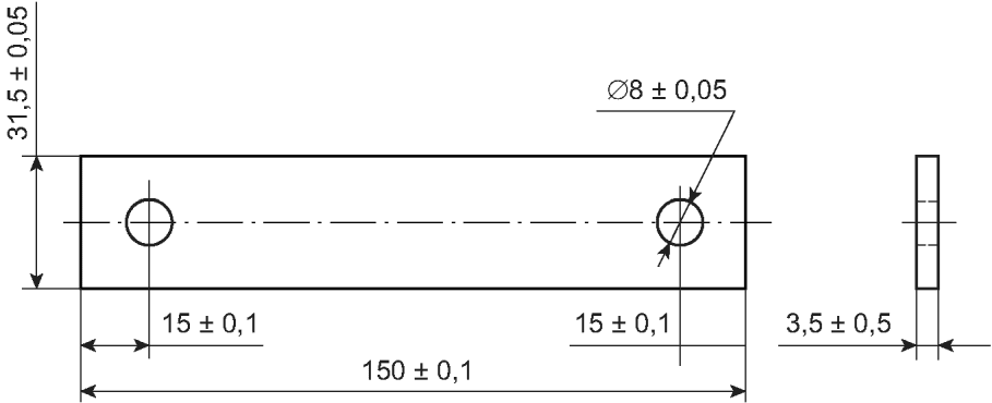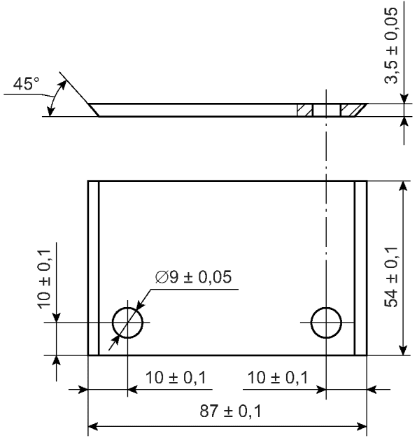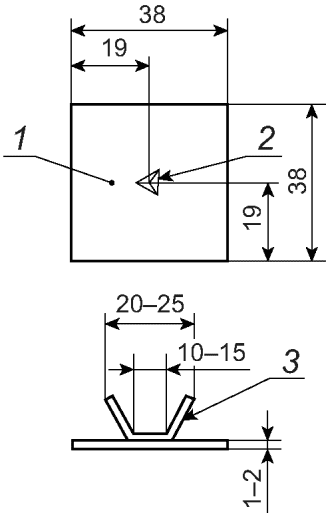 Размеры пластинок: (38 +/- 1) x (38 +/- 1) мм, толщина 1 - 2 мм. В центре пластинок должно быть углубление с углом при вершине около 120°, служащее опорной точкой при измерении длины образца. С другой стороны пластинки должны быть припаяны медные проволочные анкеры длиной 20 - 30 мм и диаметром 0,5 - 2,0 мм.