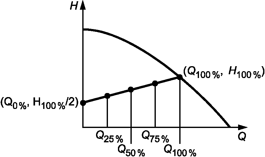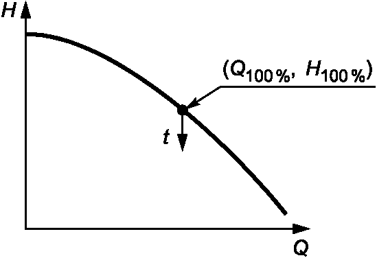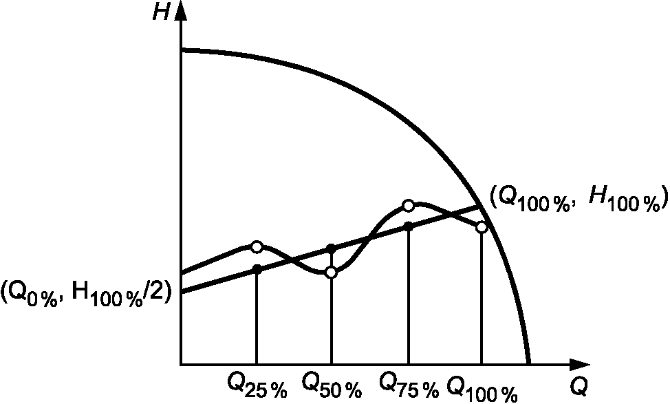 Для проведения испытания подачу необходимо отрегулировать до значения между 0,5Q и 1,5Q, при условии, что Q - это подача, соответствующая максимальной величине Q x H. Контроль подачи в период работы можно выполнять посредством контроля напора циркуляционного насоса.