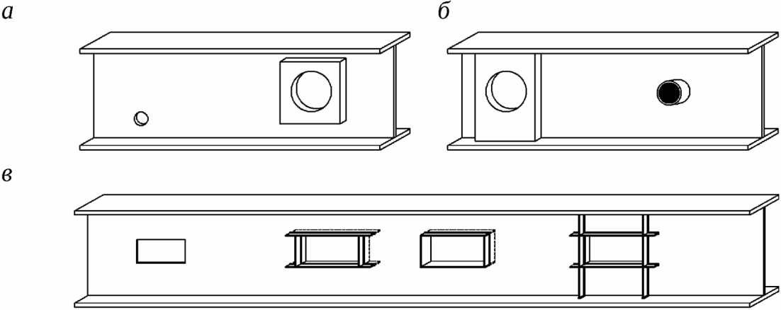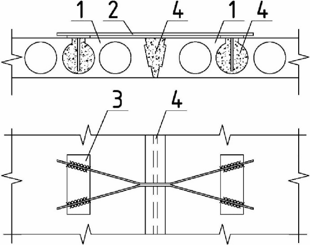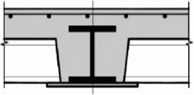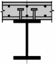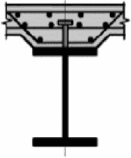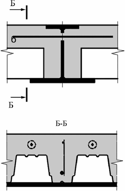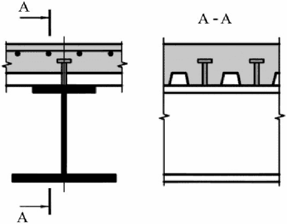 Стальная балка и плита объединены с помощью упоров в виде арматурных стержней (стержней-упоров), пропущенных сквозь отверстия в стенке балки | |