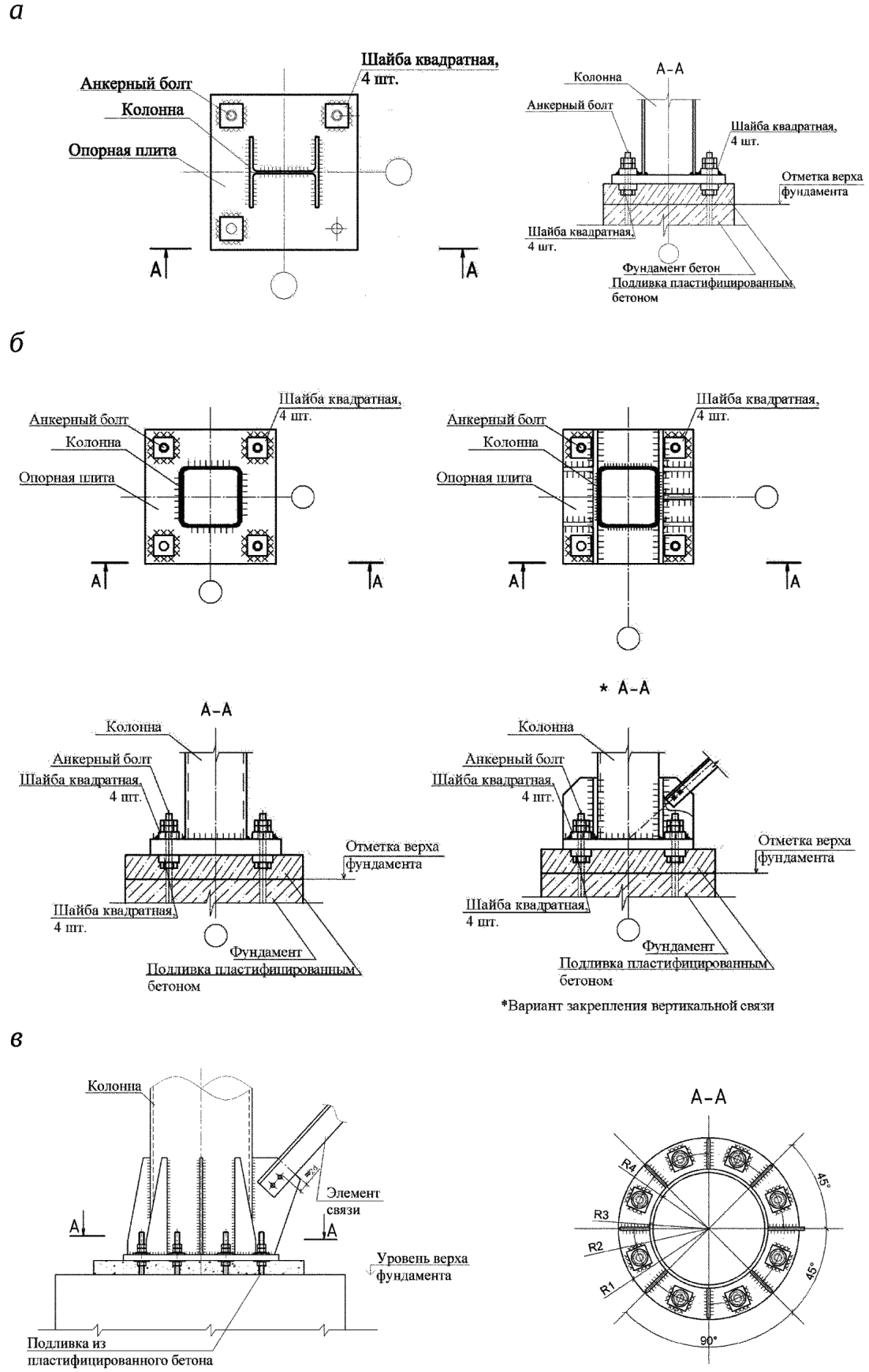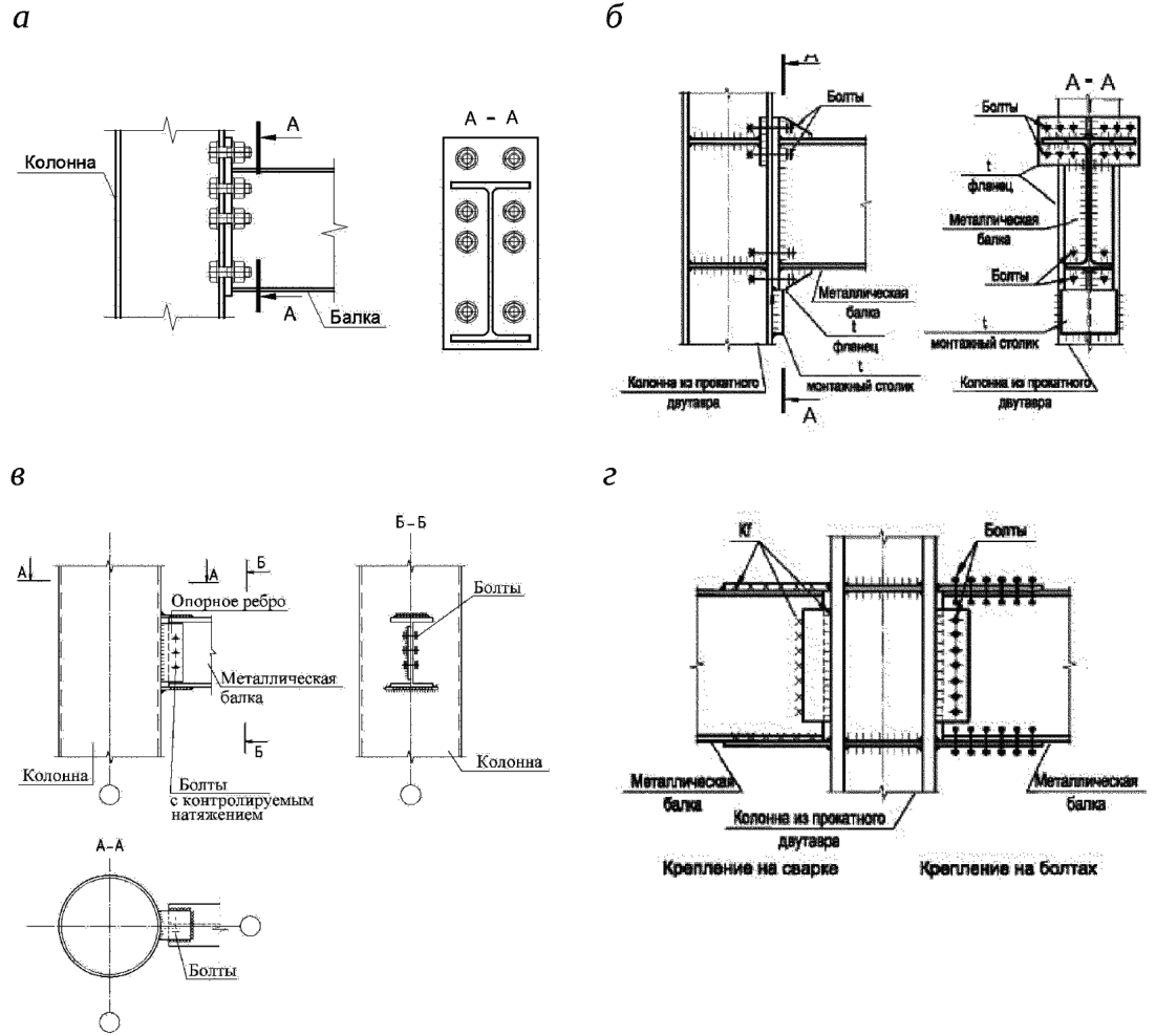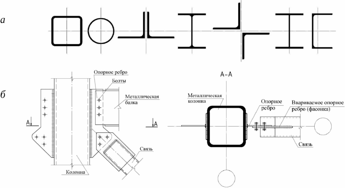 а - сечения связей; б - пример примыкания связи, выполненной
