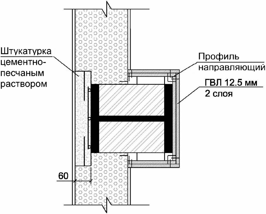 Г.1 Для колонн, одна из полок которых находится в стеновом ограждении из штучных материалов (кирпич, блоки различных видов), применяют облицовку листовыми материалами, схема приведена на