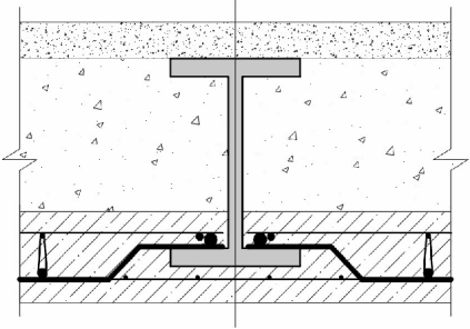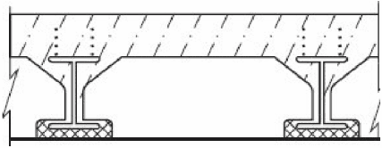 Перекрытие с камнями-вкладышами из легкого бетона и монолитной плитой по металлическим балкам | Опирание на частично обетонированную балку | |