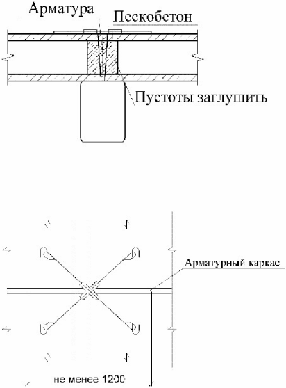 Из сборных железобетонных многопустотных плит | Опирание на верхний пояс. Опирание производят на уширенный нижний пояс металлической балки. Поперек балки устанавливается металлический каркас длиной не менее 1200 мм при условии требуемой длины опирания плит перекрытия на металлическую балку | |