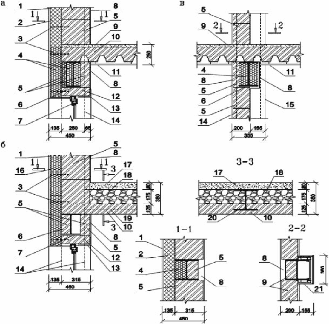 в - пример выполнения узла внутренней стены, разделяющей