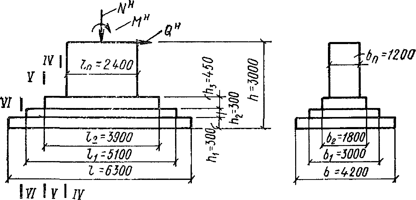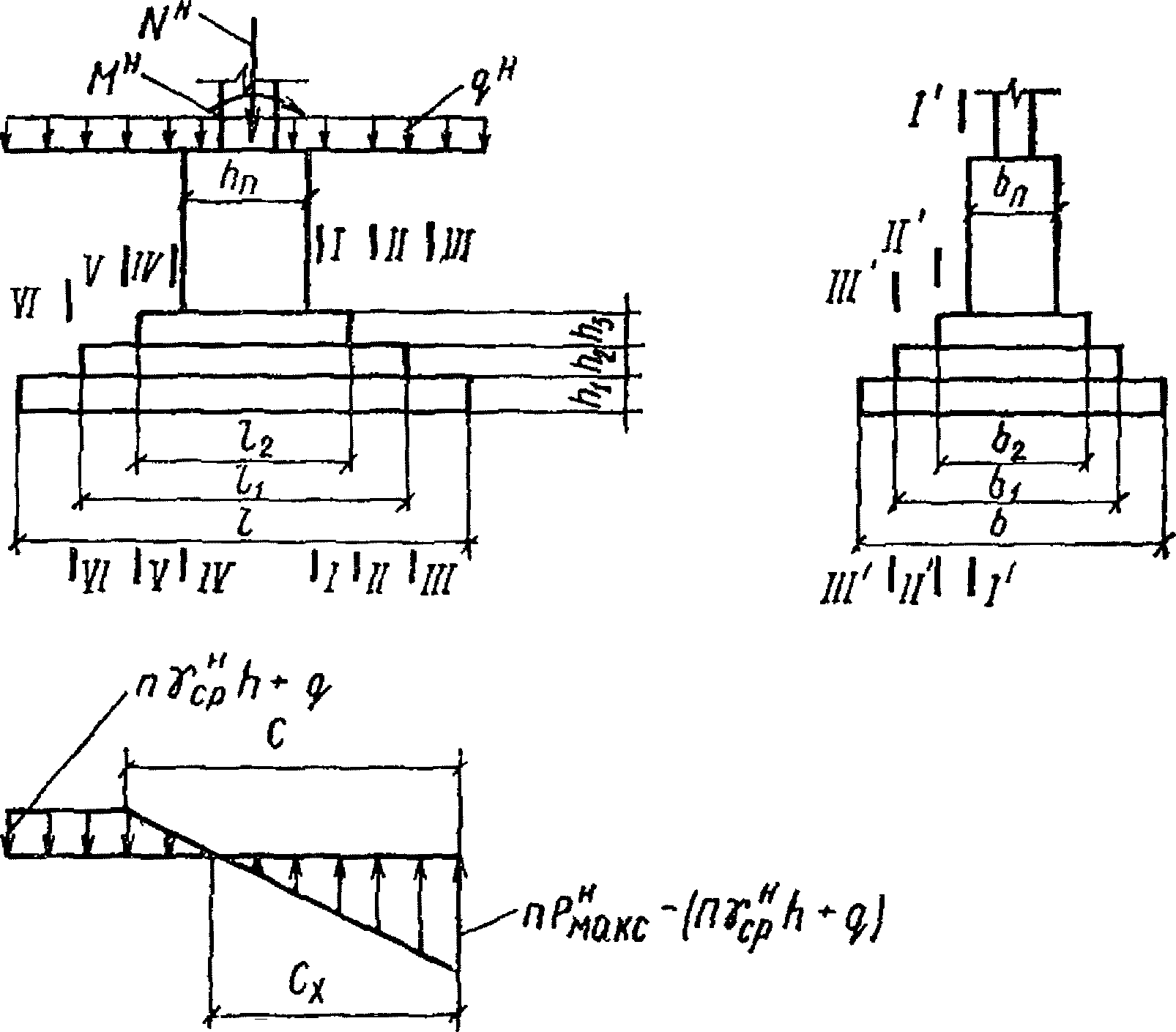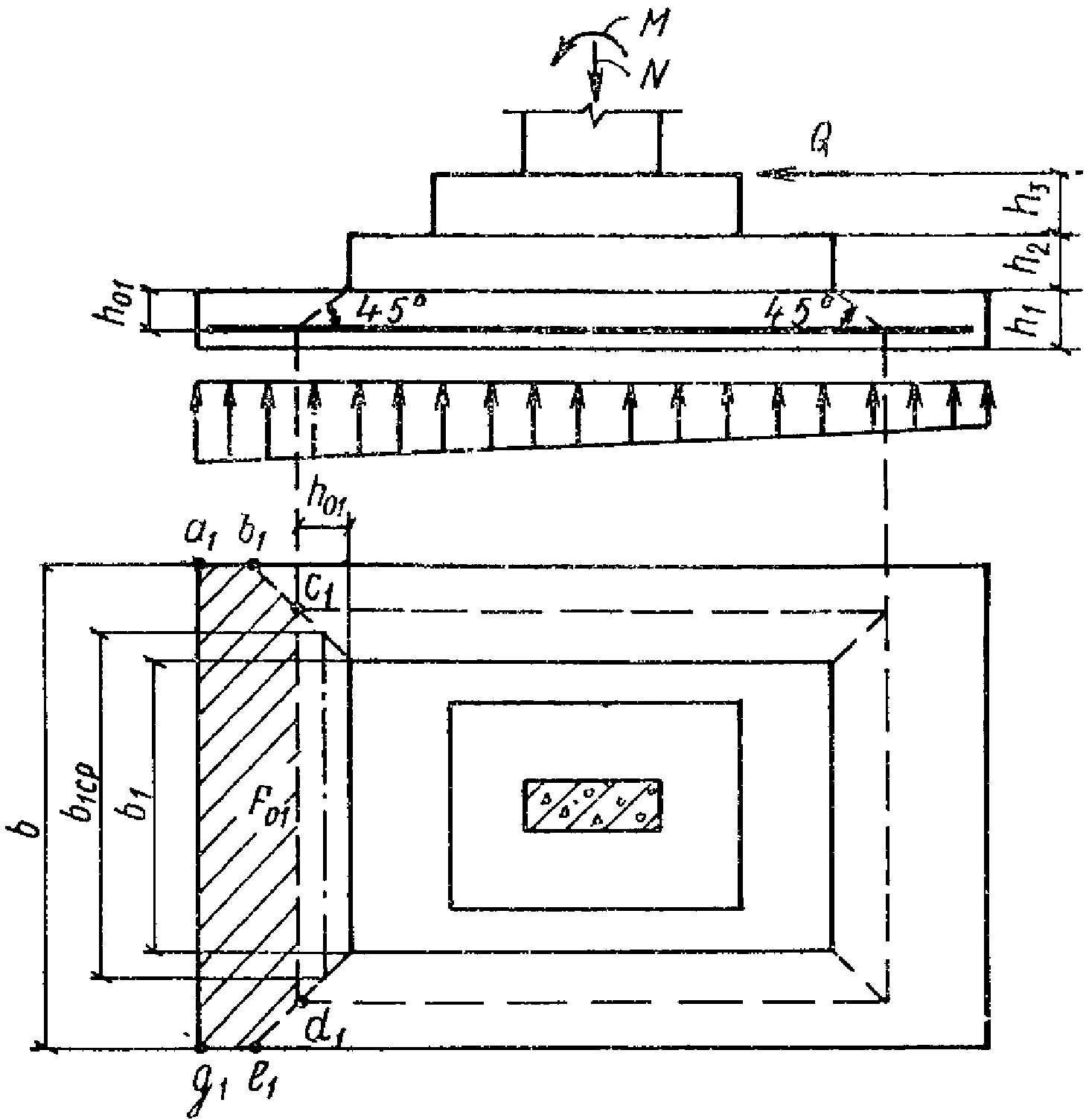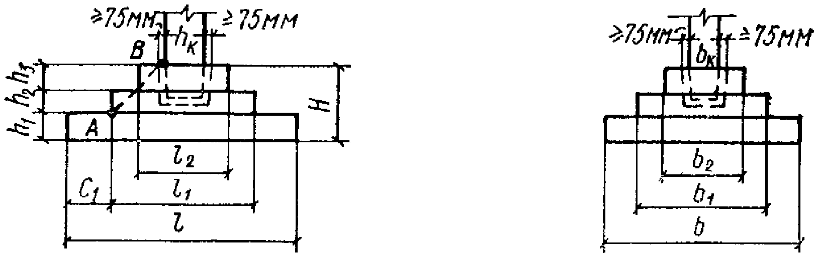 h1, h2, h3 - соответственно высота от подошвы фундамента первой, второй и третьей ступеней фундамента;