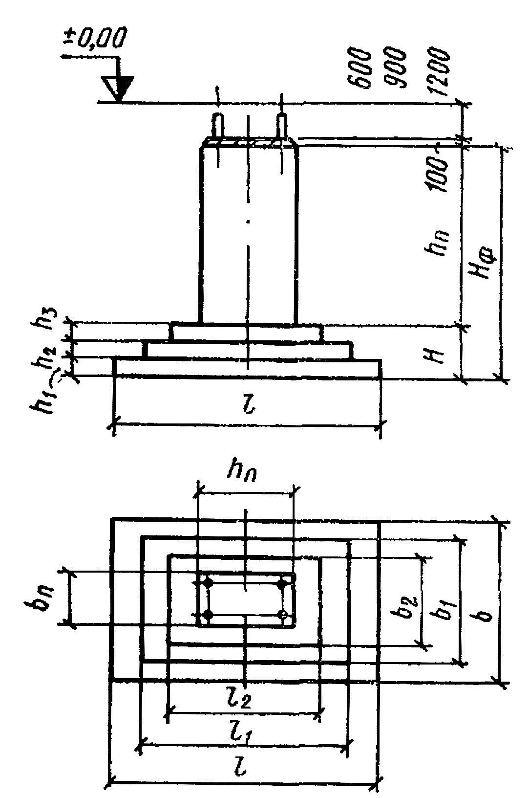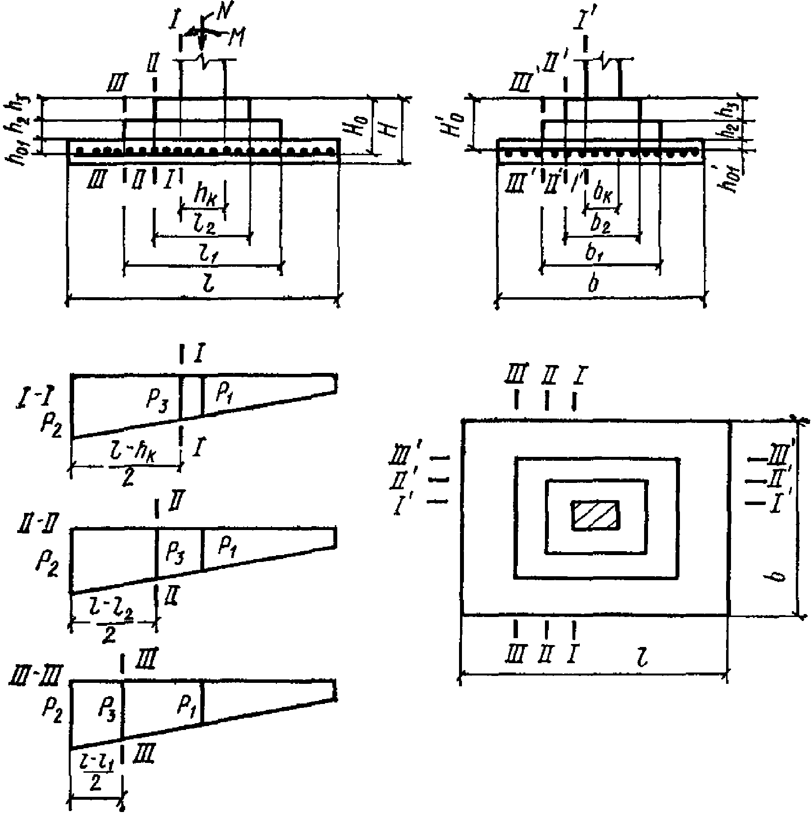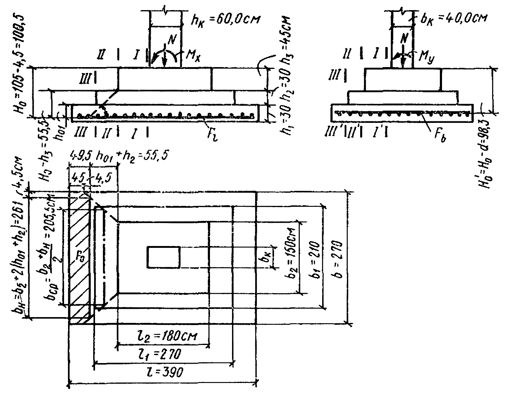 h1, h2, h3 - соответственно высота от подошвы фундамента первой, второй и третьей ступеней фундамента;