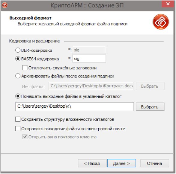 Далее требуется выбрать кодировку выходного формата файла электронной цифровой подписи