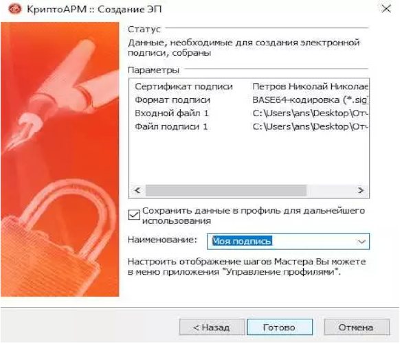 После выбора сертификата электронной цифровой подписи на экран программы будет выведено итоговое окно со статусом и параметрами выходного документа
