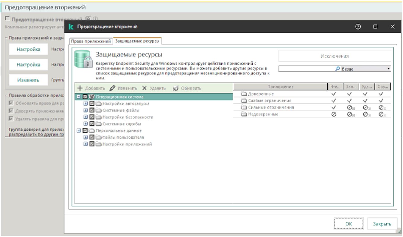 ресурсы" раздела "Предотвращение вторжений" на сервере