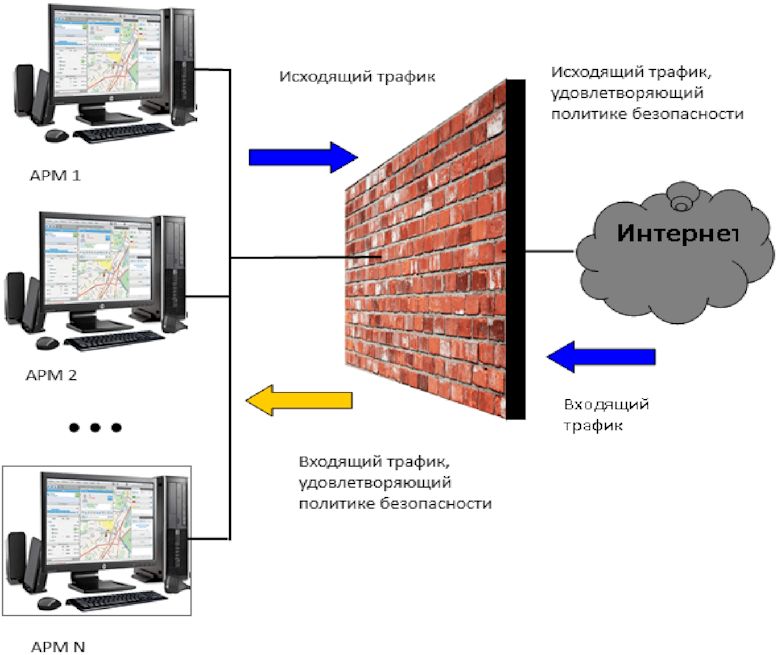Межсетевой экран (Firewall) | - локальное (однокомпонентное) или функционально-распределенное программное (программно-аппаратное) средство (комплекс), реализующее контроль за информацией, поступающей в информационную систему персональных данных и (или) выходящей из информационной системы |