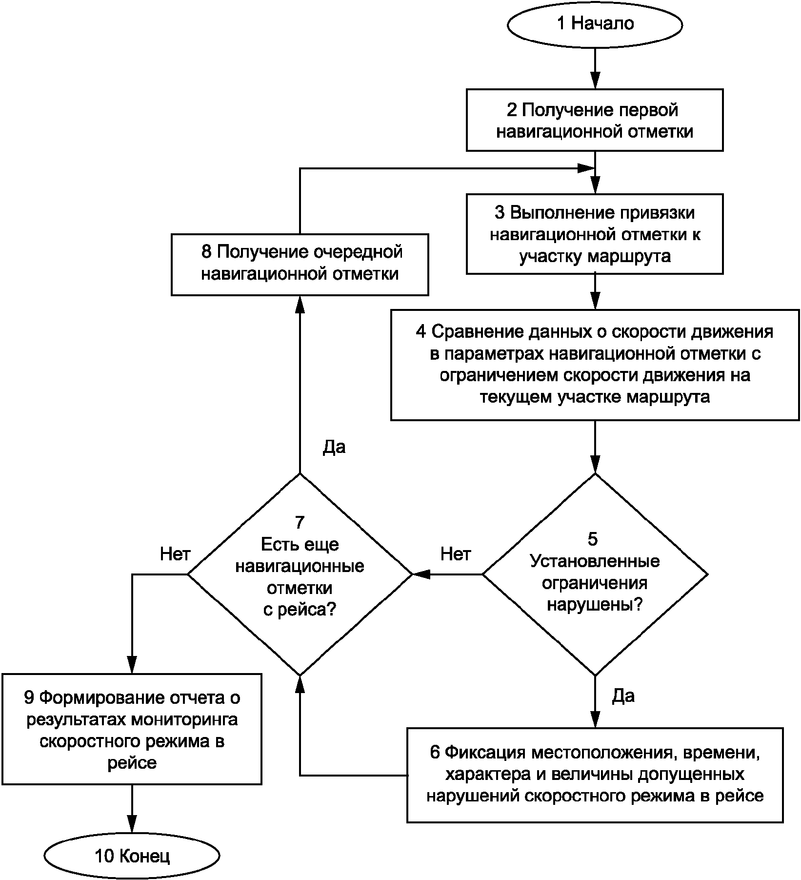 - шаг 4. Сравнение данных о скорости движения в параметрах навигационной отметки с ограничением скорости движения на текущем участке маршрута.