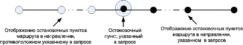 - цифровая картографическая информация, содержащая отображение маршрута и остановочных пунктов маршрута с выделением указанного остановочного пункта и выделением различным цветом остановочных пунктов маршрута, следующих в указанном и противоположном направлении;