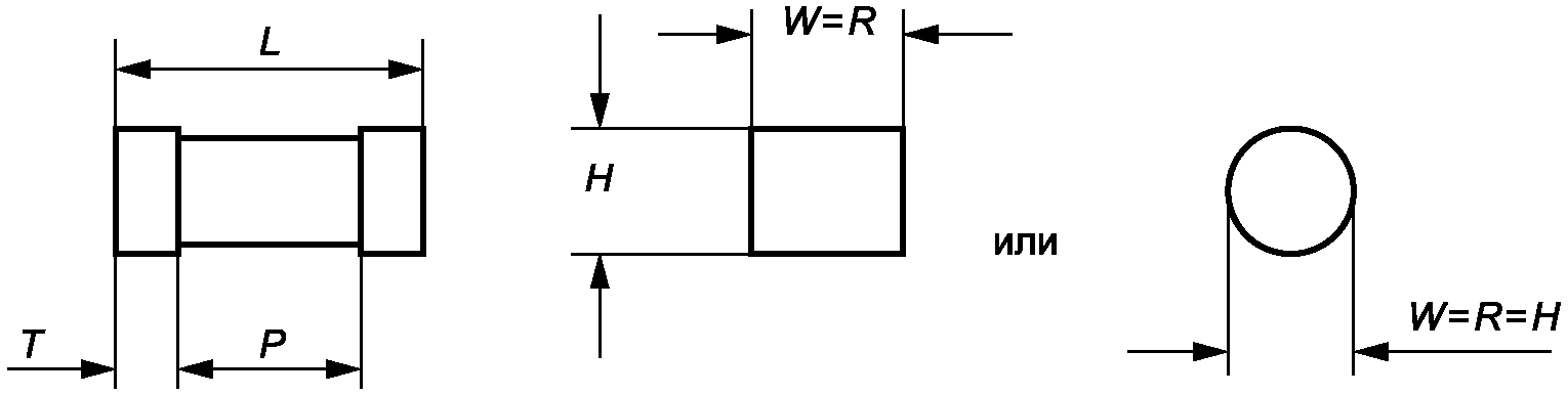 Допускается любая форма плавкой вставки; точка, в которой выводы выступают из корпуса, выбирается произвольно, и выводы можно изменять. Ниже показано несколько альтернативных форм плавкой вставки: Примечание - Расстояние между выводами, P, выбрано согласно IEC 60664-1 с учетом степени загрязнения 2 и категории перенапряжения II (нагрузка менее 1500 ч). |