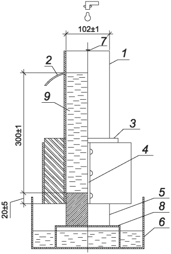 - после водонасыщения прибор с образцом извлекают из воды и вытирают свободную поверхность испытуемого образца до удаления стекающих капель. Затем устройство с образцом помещают на перфорированную подставку в емкость для сбора прошедшей жидкости. Сверху в трубу подается вода, напор подачи регулируется в зависимости от пропускной способности переливной трубки и водопроницаемости образца в приборе. Высота столба воды в трубе в течение всего измерения должен быть равна (300 +/- 1) мм;