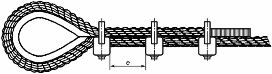 таблицу B.2. Завернуть указанную длину конца каната назад от коуша или петли. Поставить первый зажим на ширину перемычки от глухого конца каната. Установить U-образный болт через глухой конец каната; при этом рабочая часть каната должна зайти в гнездо. Попеременно и равномерно зажать гайки до достижения рекомендованного крутящего момента.