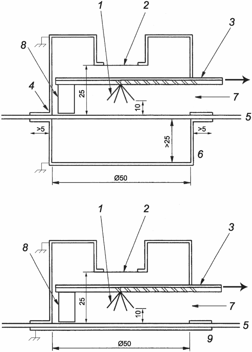 3 - подвижная пластина; 4 - заземленный корпус; 5 - образец;