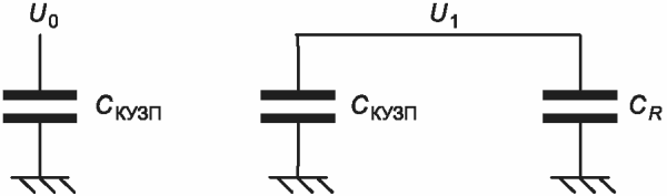 рисунок А.1). Заряд разделится между опорным конденсатором и КУЗП в соотношении, соответствующем соотношению их емкостей. Например, если КУЗП имеет емкость 20 пФ, а опорный конденсатор 2 нФ, то 0,99% всего заряда останется на КУЗП и 99,01% заряда перейдет на опорный конденсатор. Для практических целей при использовании опорного конденсатора его емкость должна быть как минимум в 100 раз больше, чем ожидаемая емкость на КУЗП, тогда можно будет предположить, что весь заряд передается на опорный конденсатор.