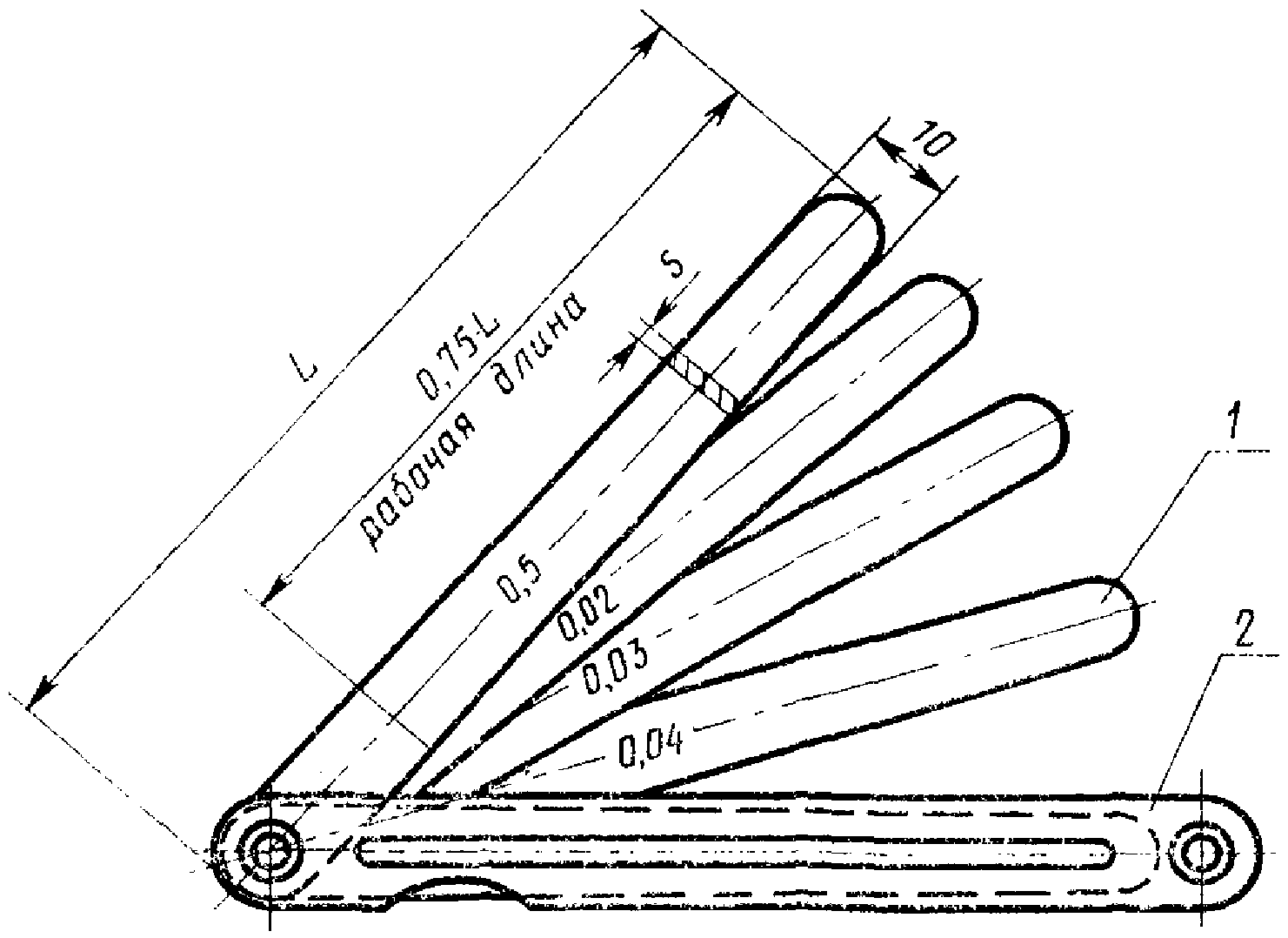 1.2. Номинальная толщина s щупов должна выбираться из ряда: 0,02; 0,03; 0,04; 0,05; 0,06; 0,07; 0,08; 0,09; 0,1; 0,15; 0,2; 0,25; 0,3; 0,35; 0,4; 0,45; 0,5; 0,55; 0,6; 0,65; 0,7; 0,75; 0,8; 0,85; 0,9; 0,95; 1,0 мм.