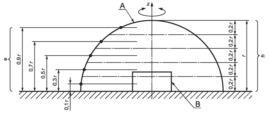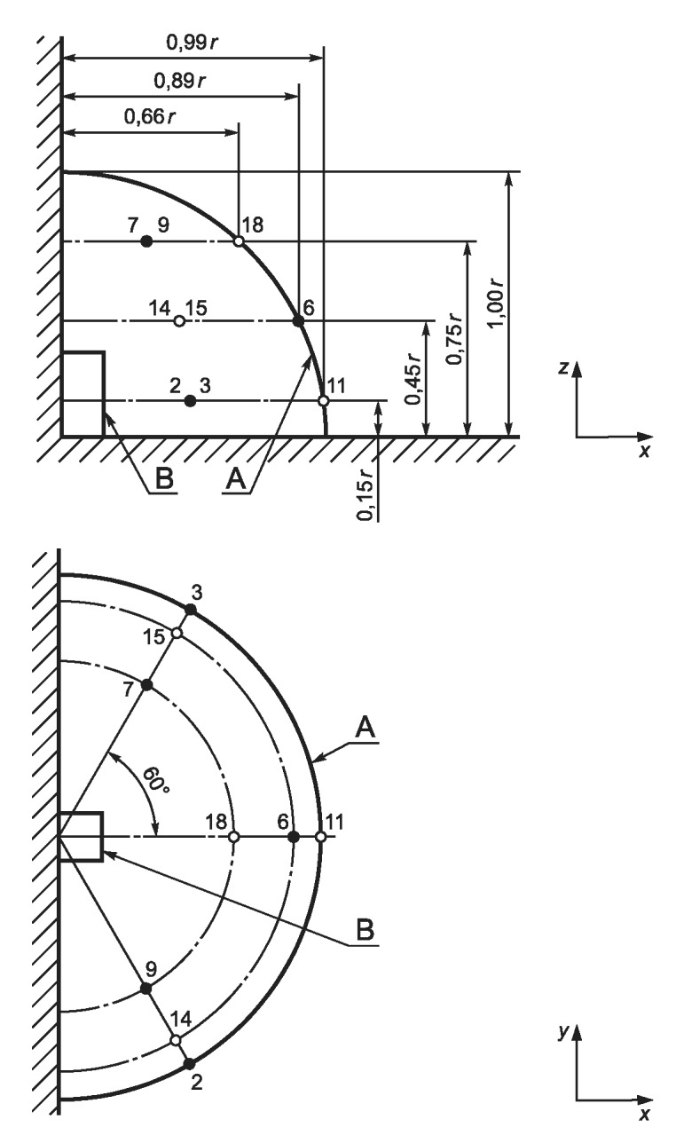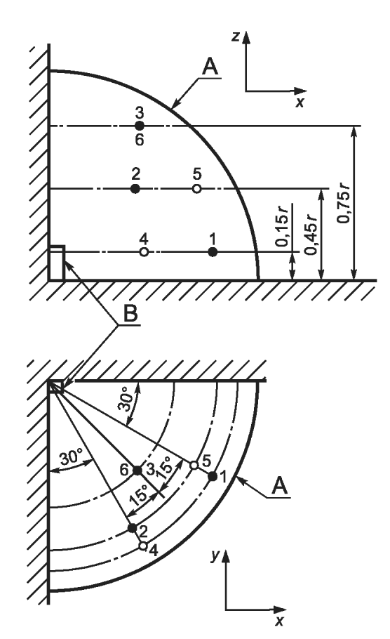 Условия испытаний, соответствующие требованиям настоящего стандарта, могут быть созданы внутри помещений или на открытом воздухе и предполагают наличие одной или нескольких звукоотражающих плоскостей, на которые или вблизи которых устанавливают испытуемый источник шума. Идеальные условия испытаний для методов настоящего стандарта представляют собой открытое пространство без границ и отражающих поверхностей, за исключением предусматриваемой методом звукоотражающей плоскости или плоскостей (таким условиям соответствует, например, аттестованная заглушенная камера со звукоотражающим полом). При отступлении условий испытаний от идеальных применяют соответствующие поправки (в пределах заданных ограничений).