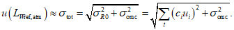 В случае незначительной корреляции между входными величинами суммарную стандартную неопределенность u(LWref,atm), дБ, рассчитывают по формуле