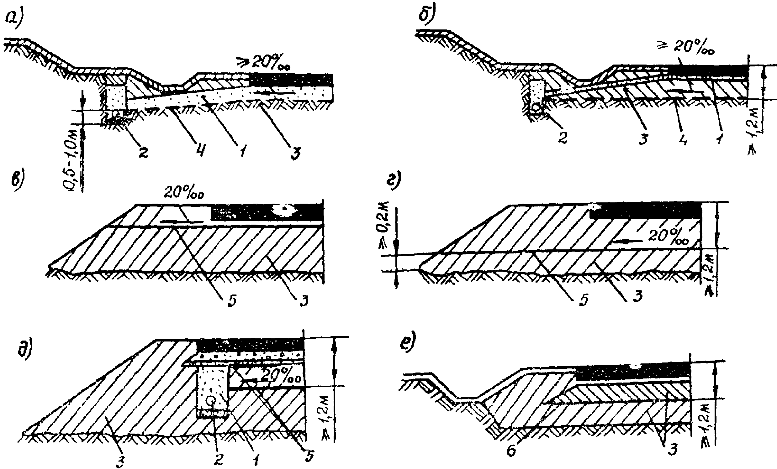 <*> предусматривают различные решения по защите земляного полотна в процессе строительства: отвод воды с обочин и их укрепление; осушение разделительной полосы и полосы отвода; устройство верхней части земляного полотна из непучинистых или слабопучинистых грунтов; устройство морозозащитных слоев, в том числе из некондиционных песков (песчаных грунтов); устройство теплоизоляционных слоев, дренирующих слоев и дренажей мелкого заложения, дренажей для понижения уровня грунтовых вод, армирующих, дренирующих, капилляропрерывающих и гидроизолирующих прослоек; улучшение зернового состава грунтов и обработку их вяжущим, а также повышение высоты насыпи по сравнению с высотой, запроектированной по условиям рельефа местности и снегонезаносимости дороги.
