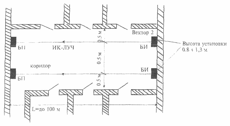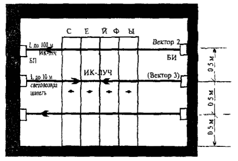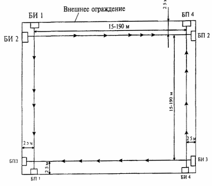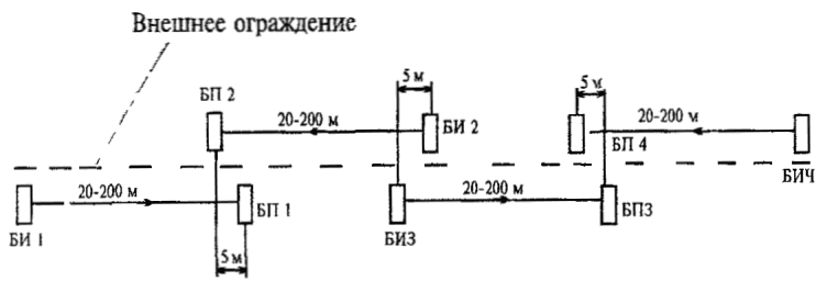 В зависимости от характеристик ОО (протяженность, количество помещений, этажность и т.п.) и величины материальных ценностей, размещенных на объекте, его охрана может быть реализована посредством одного или нескольких шлейфов сигнализации. В том случае, если структура охраны объекта включает несколько шлейфов, размещенных таким образом, что при проникновении на ОО нарушителя и движении к материальным ценностям, ему необходимо преодолеть несколько охраняемых зон, контролируемых различными шлейфами с выходами на отдельные номера ПЦН, охрану следует рассматривать как многорубежную. Таким образом, шлейф или совокупность шлейфов, контролирующих охраняемые зоны на пути движения нарушителя к материальным ценностям ОО и имеющих выход на отдельный номер ПЦН, называется рубежом сигнализации, а совокупность охраняемых зон, контролируемых рубежом сигнализации, представляет собой рубеж охраны.