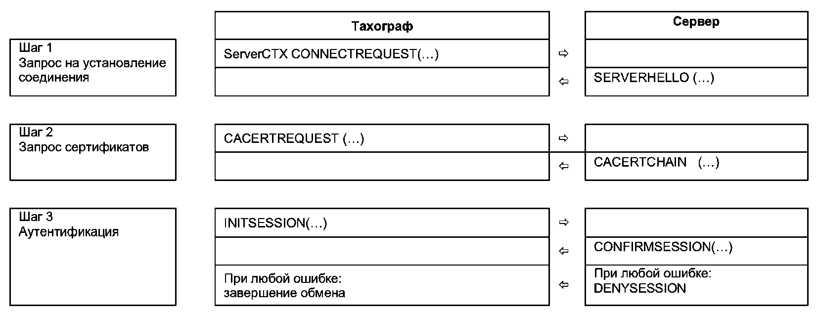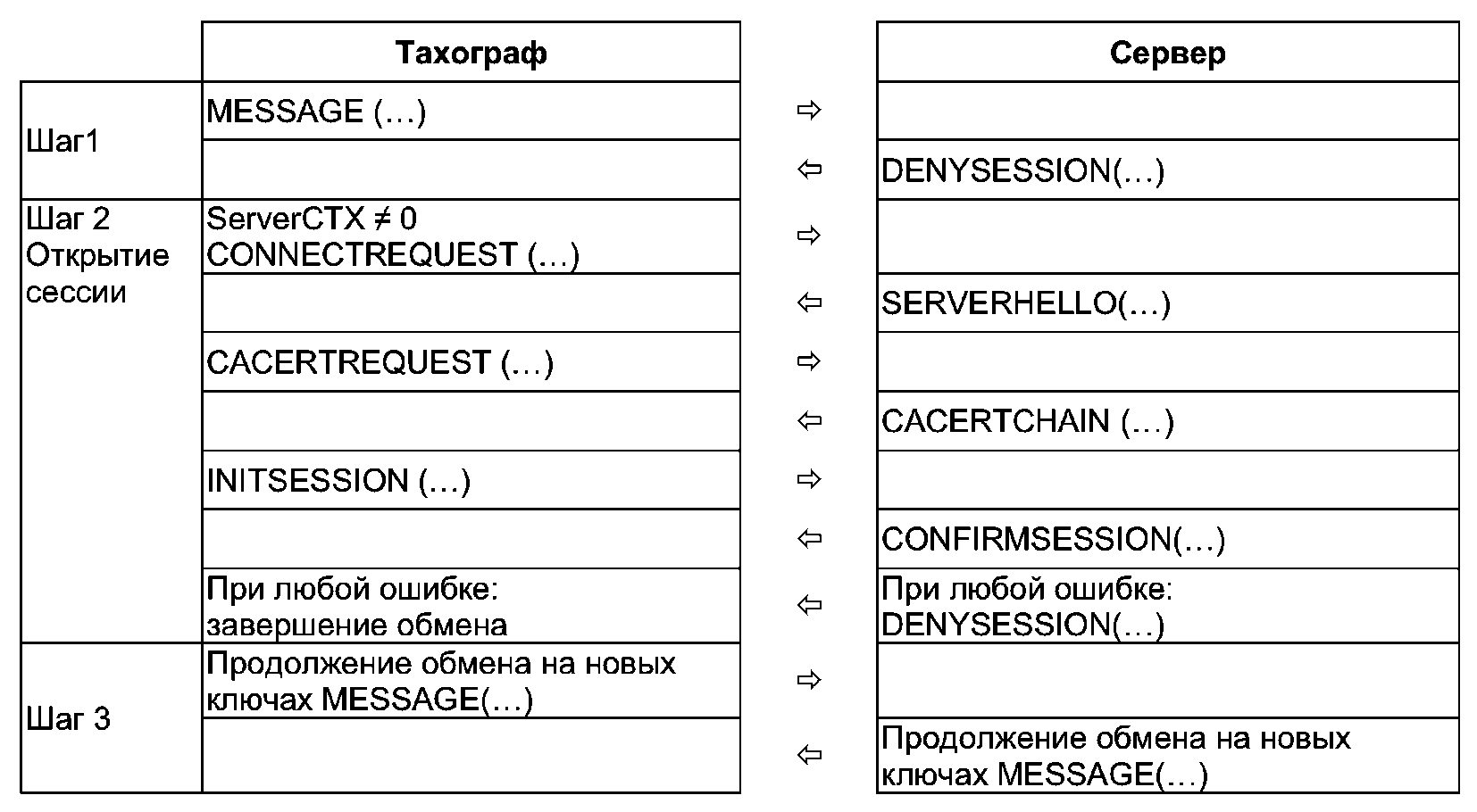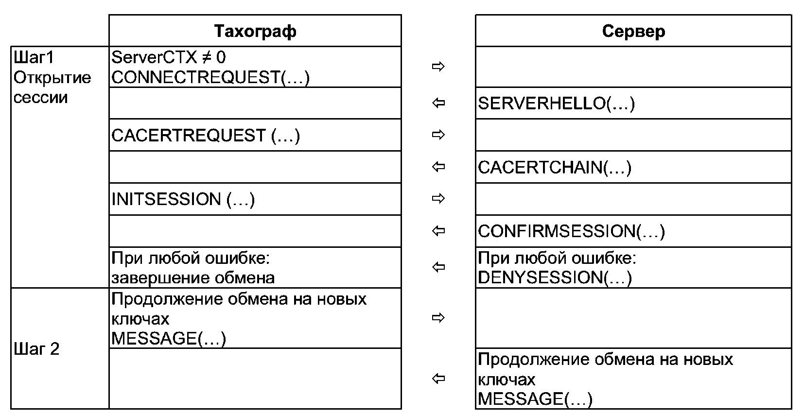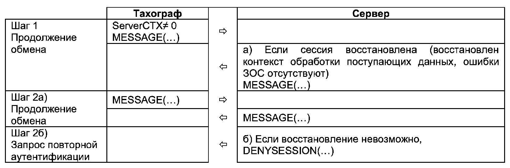 Если после получения успешного ответа на запрос произошел разрыв TCP/IP соединения (или если нет ответов на запросы, что приводит к разрыву TCP/IP соединения), то тахограф заново подключается по TCP/IP к серверу и посылает следующее сообщение со значением поля ServerCTX, полученного из последнего успешного ответа от сервера.