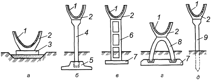 б - укладка на стоечные опоры с фундаментом стаканного типа;