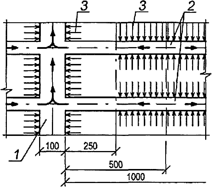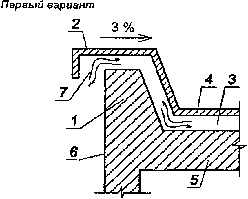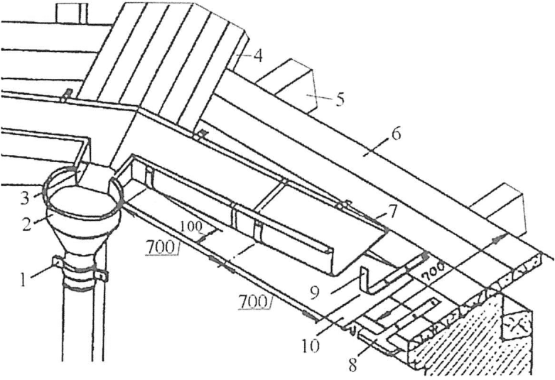 При настенном водоотводе сбор воды с кровли осуществляется настенными желобами 7, уложенными на сплошной деревянный настил 6 или карнизную плиту; по настенному желобу 7 вода стекает в лоток 3 разжелобка 4, соединенному с воронкой 2 водоотводящего стояка (рисунок Л.1).
