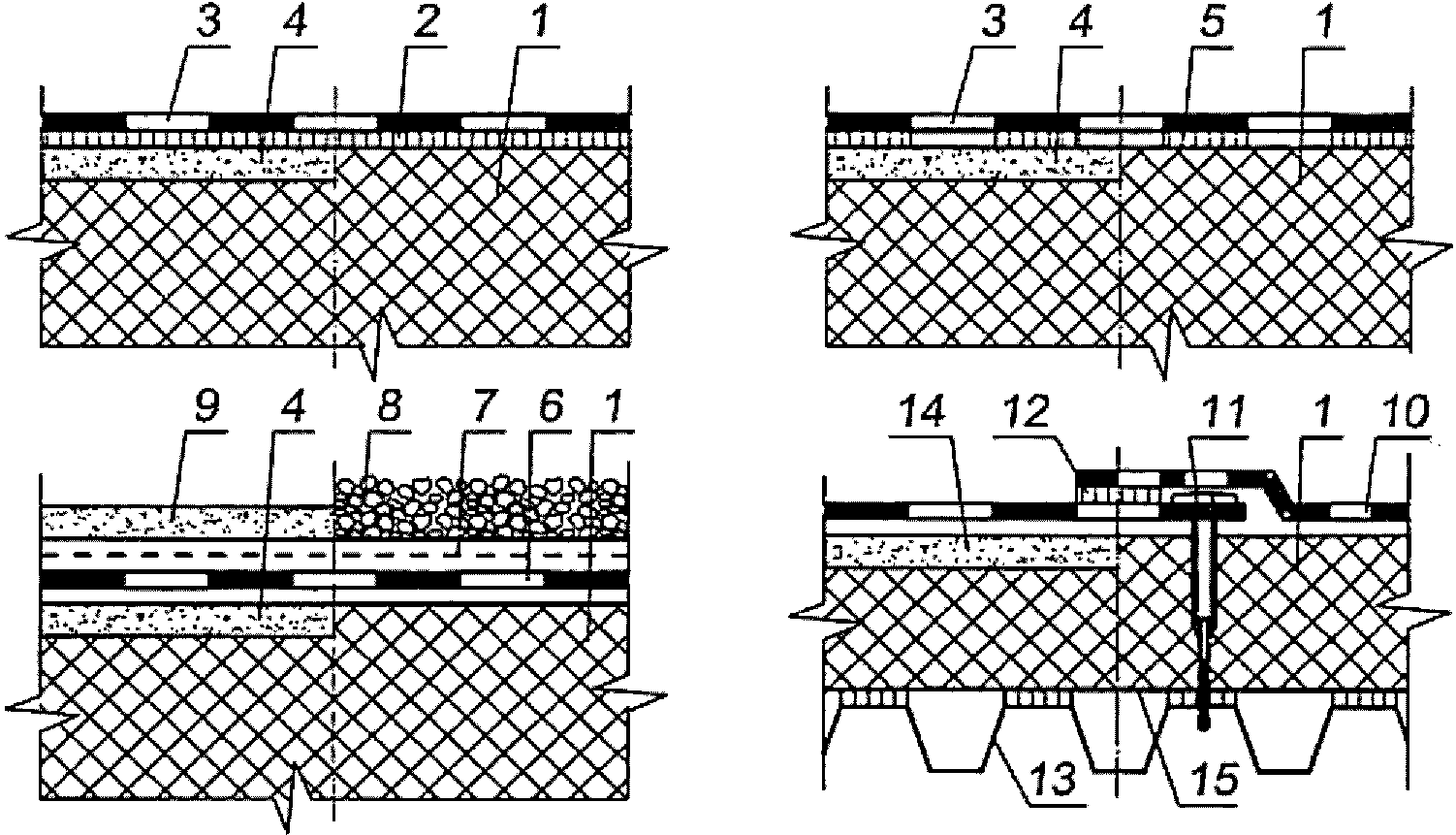 Интенсивность пешеходной нагрузки на кровлю | Варианты применения теплоизоляционных плит | Число слоев водоизоляционного ковра и способ его крепления |