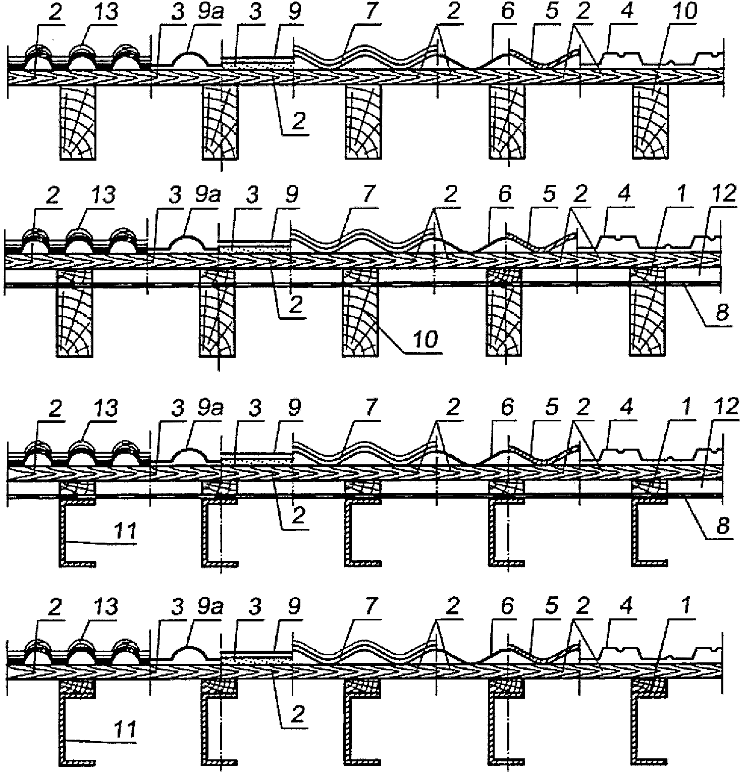 с деревянными вкладышами; 14 - рулонный битумный материал;