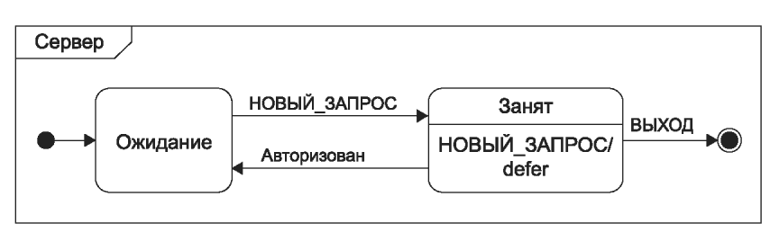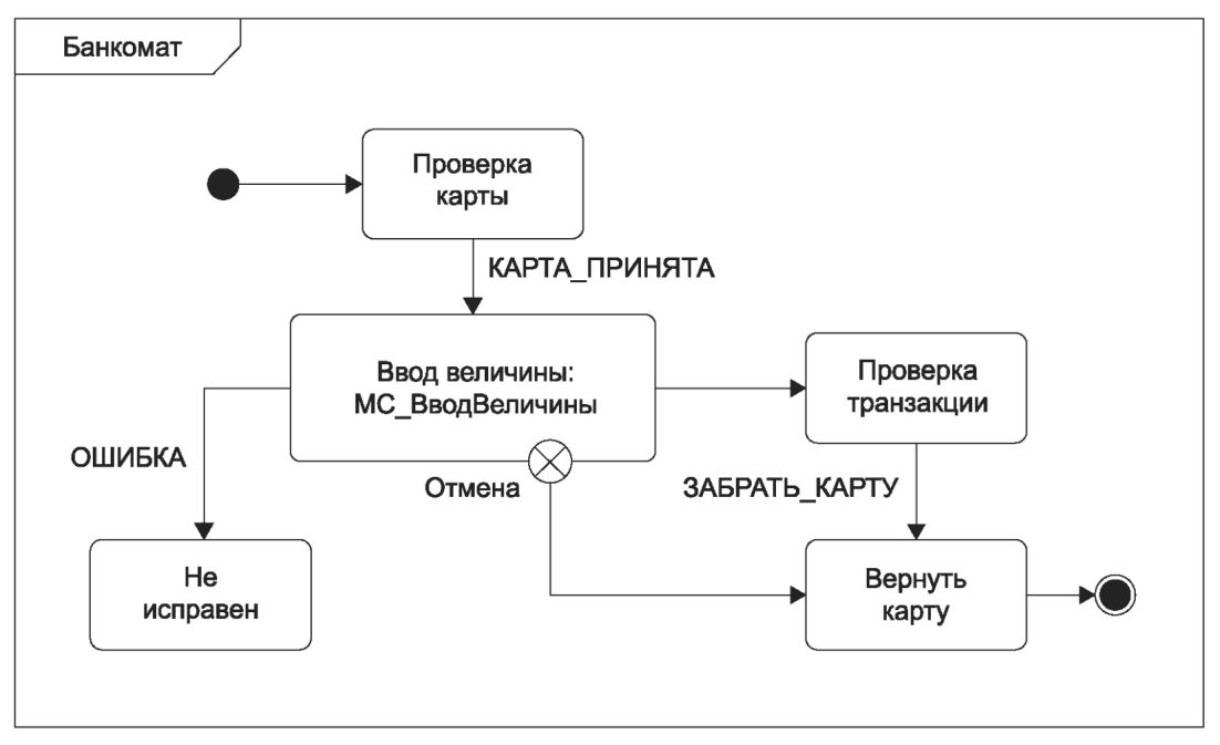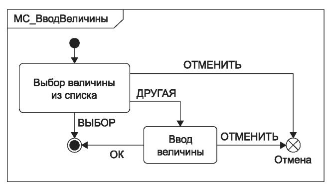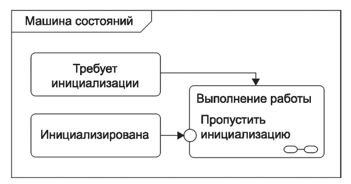 рисунке 47 б показана та же машина состояний с использованием обозначения точки выхода на рамке машины состояний.