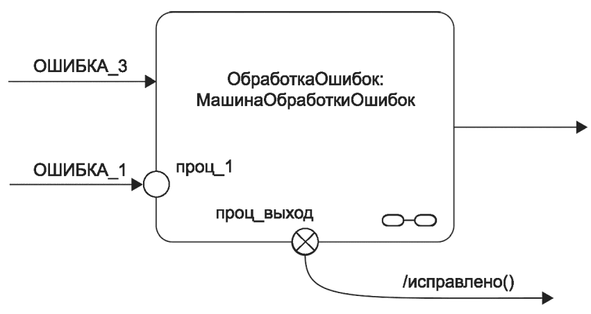 рисунке 46 переход, вызванный событием "ОШИБКА_1", завершится в точке входа "проц_1" машины состояний "МашинаОбработкиОшибок". Событие перехода "ОШИБКА_3" подразумевает использование перехода по умолчанию для состояния "ОбработкаОшибок".