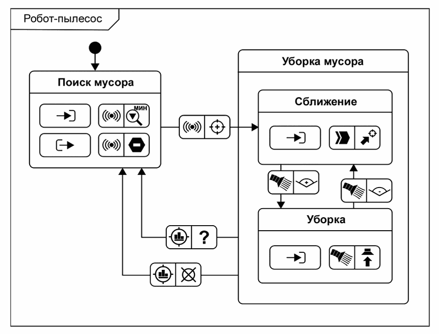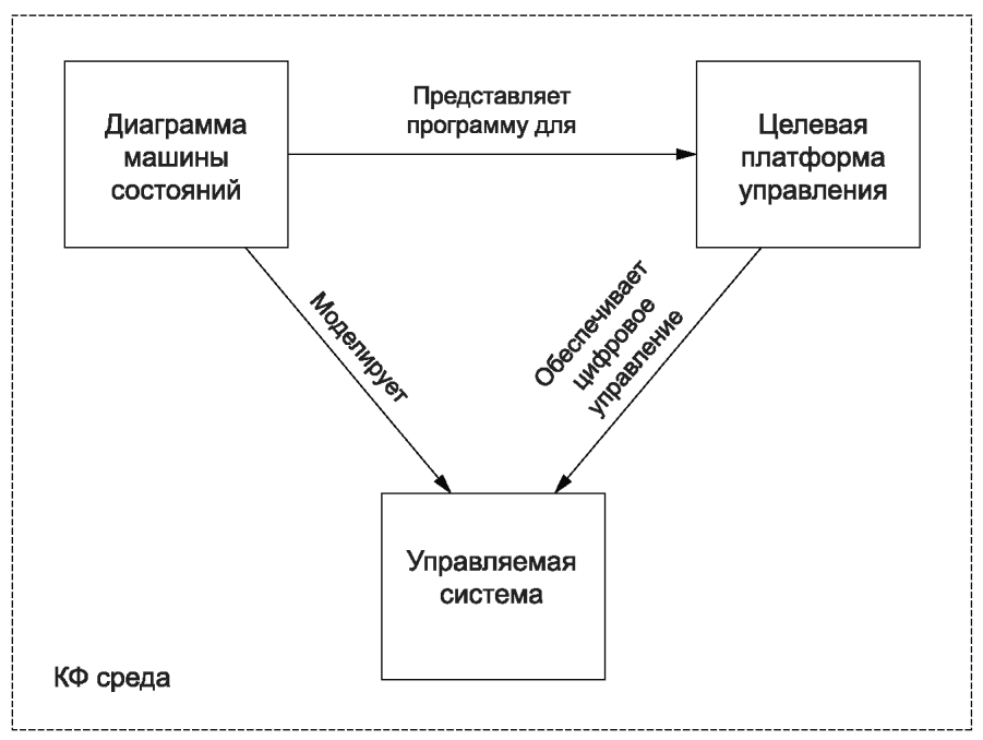 [3] и позволяет описать в виде визуальной диаграммы машины состояний универсальные программы управления системами, в т.ч. программируемыми электронными приборами и киберфизическими системами, а также протоколы и общие алгоритмы поведения систем.