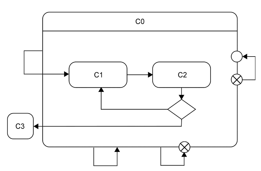 Переход, исходящий из точки выхода "проц_выход" вложенной машины состояний, будет выполнять действие "исправлено()" в дополнение к тому, что выполняется в машине состояний "ОбработкаОшибок". Этот переход должен был быть запущен внутри машины состояний "ОбработкаОшибок". Наконец, переход, исходящий из границы состояния с вложенной машиной состояний, принимается за результат события завершения, генерируемого, когда "МашинаОбработкиОшибок" достигает своего конечного состояния.