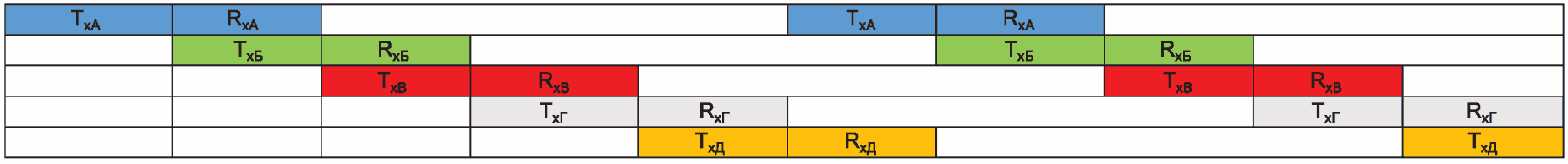 Tint, в период которого каждое АСП РВ осуществляет последовательную передачу пакетов. После окончания передачи пакета АСП РВ сразу переходит в режим приема. Это требует