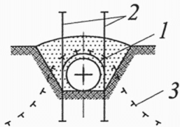 II Подземный способ с термоохладителями 1 - хомут анкерного устройства для закрепления газопровода от всплытия; 2 - термоохладители; 3 - верхняя граница многолетнемерзлого грунта | Преимущества: те же, что и для способа I, а также возможность значительно уменьшить осадки трубопровода. Недостатки: возможность оттаивания на отдельных участках; необходимость разработки мерзлых грунтов; затруднительность наблюдения и ремонта; надзор за термоохладителями | II группа местности для теплых участков |