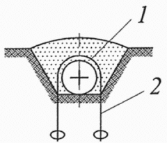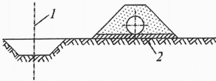 IV Наземный способ с использованием местного грунта 1 - канава-резерв; 2 - выравнивающий слой | Преимущества: меньшая вероятность повреждений; стабильность (относительная) внешней среды; отсутствие анкерных устройств; технологичность строительства; меньшие (по сравнению с подземной прокладкой) затруднения при наблюдении и ремонте Недостатки: значительный объем земляных работ | IV и III группы местности. Для холодных участков обвалование необязательно |
