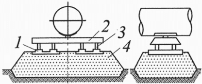 V Надземный способ с низкими опорами 1 - железобетонная плита; 2 - ригель; 3 - механизм регулирования опор; 4 - подушка из мелкозернистого уплотненного песка | Преимущества: исключается влияние на мерзлые грунты; отпадает необходимость разработки мерзлых грунтов; легкость наблюдения. Недостатки: дорогое и сложное строительство; дополнительные металловложения; значительный объем разрушений при авариях; нестабильность внешней среды и возможность загустения нефти и других вязких продуктов | II группа местности для горячих участков. I группа местности для теплых участков с величиной относительного сжатия многолетнемерзлых грунтов при оттаивании более 0,1 |